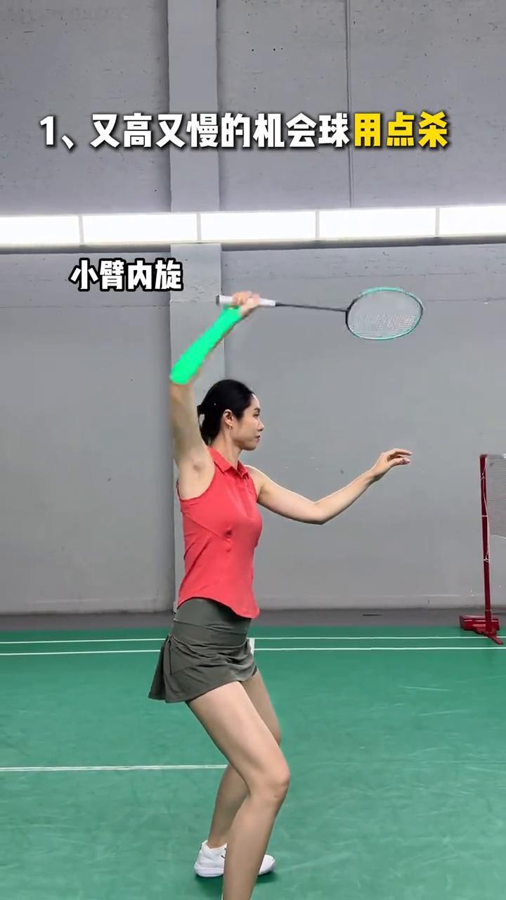 ·1、又高又慢的机会球用点杀,手肘抬高,小臂内旋,球就会迅速向下。
