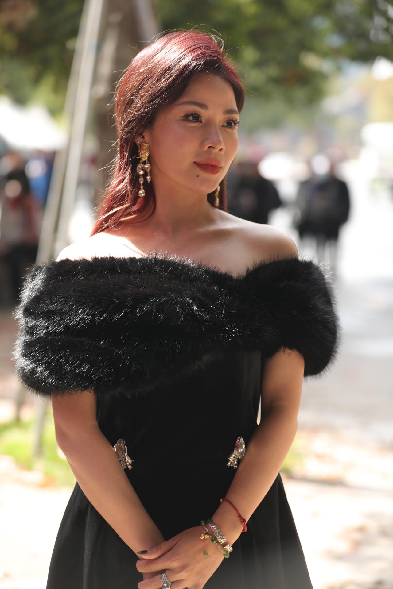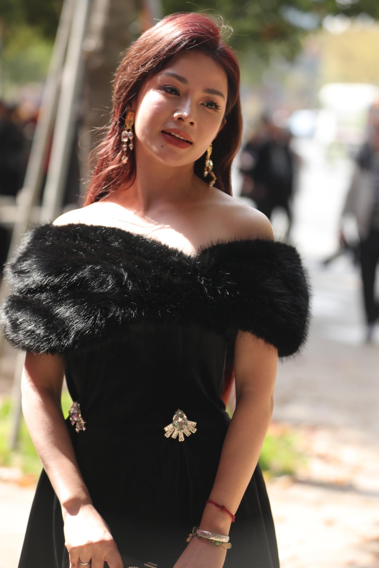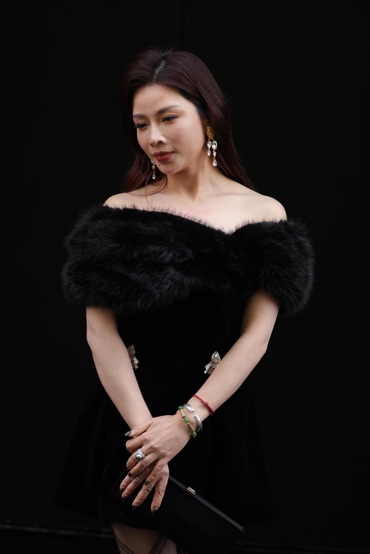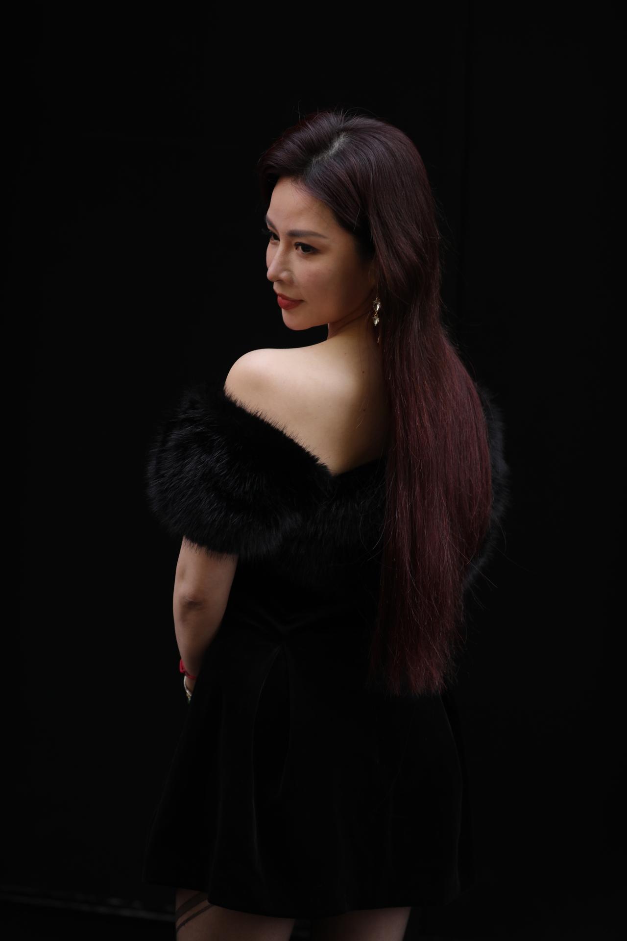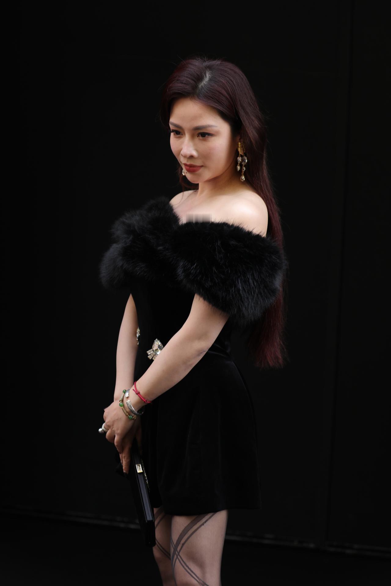 黑色抹胸礼服衬得肌肤胜雪,肩头的黑貂毛披肩随着她的动作轻颤,柔软而贵气。胸前的水晶胸针与耳上的宝石耳饰,在光影中折射出细碎的光芒。