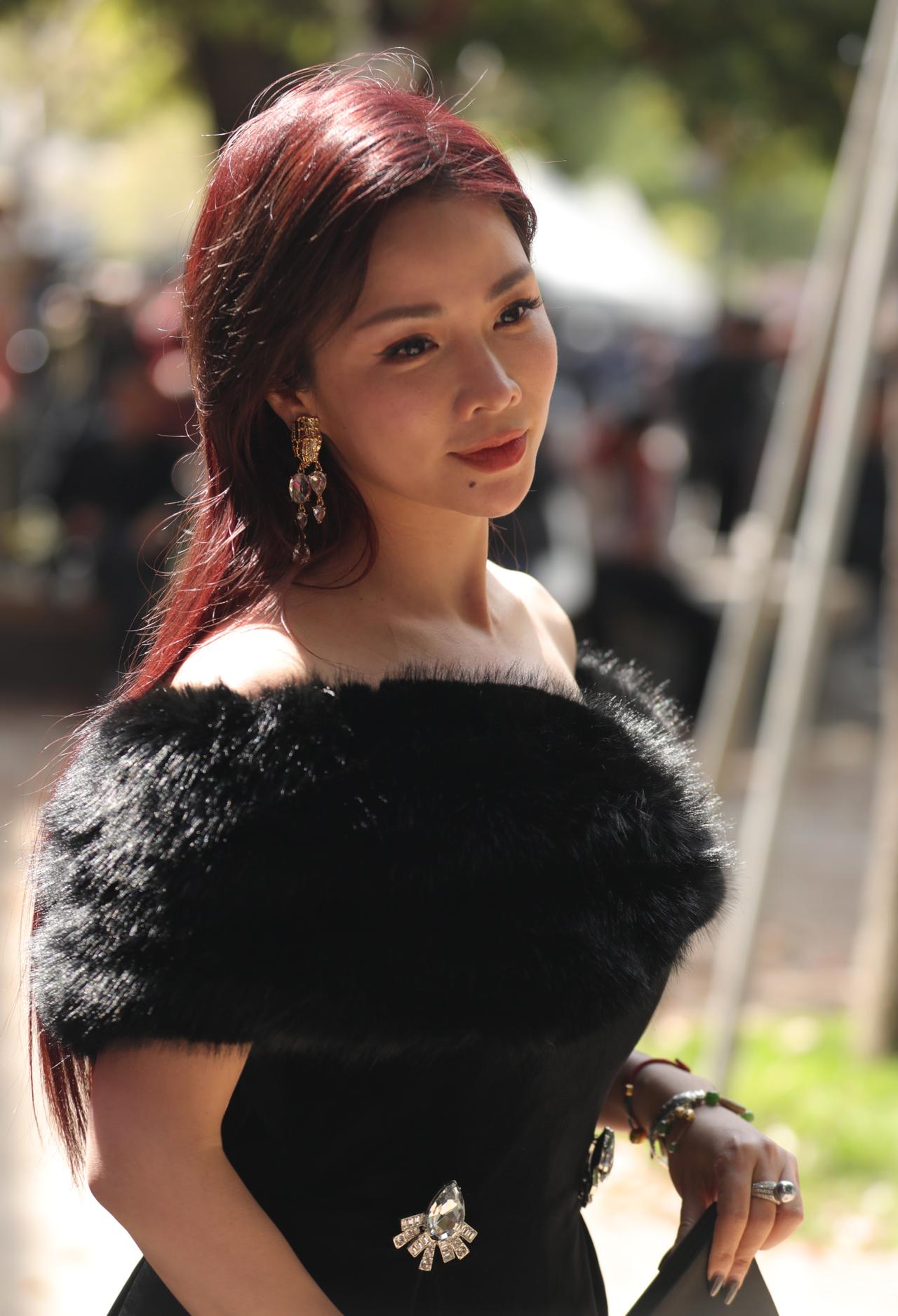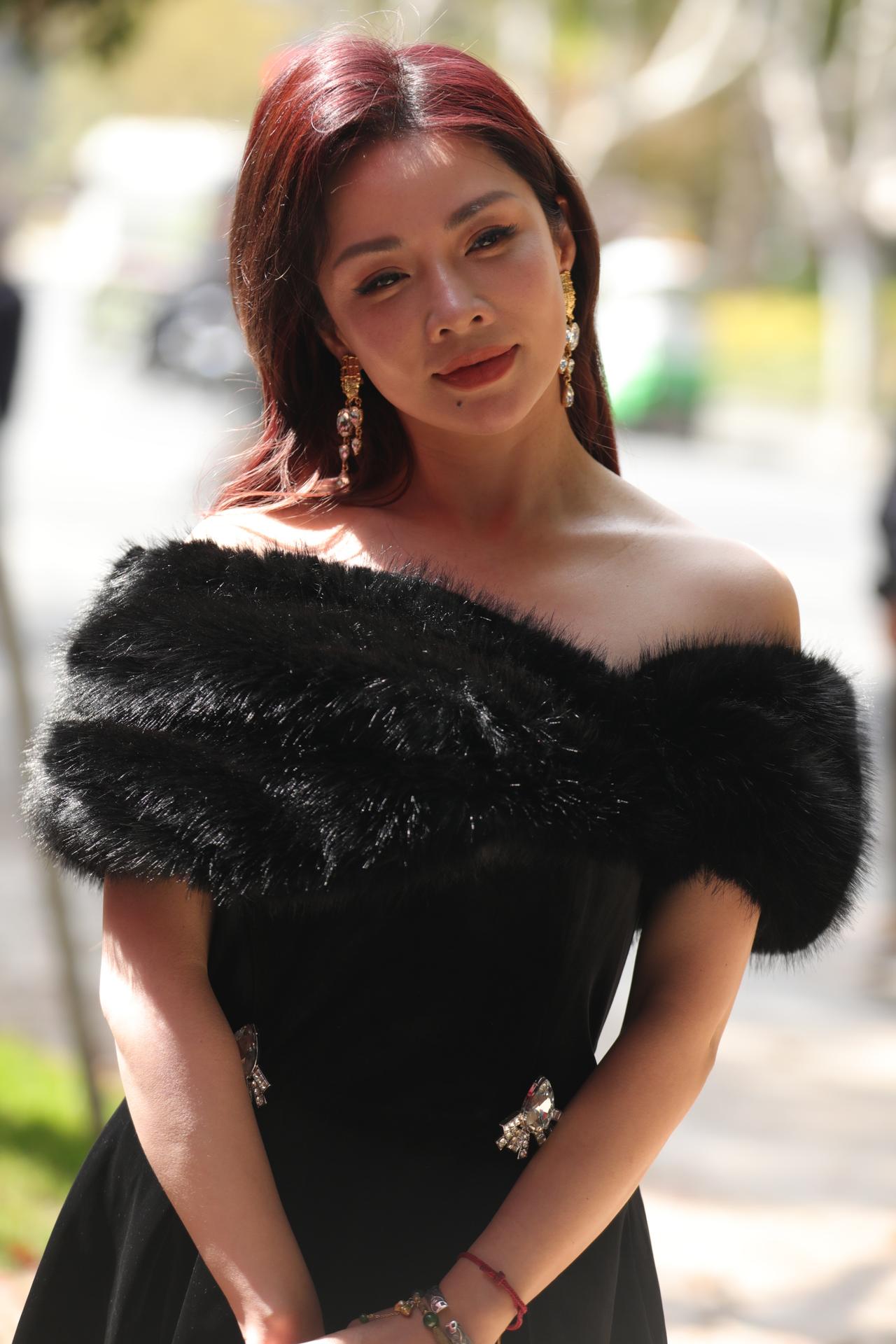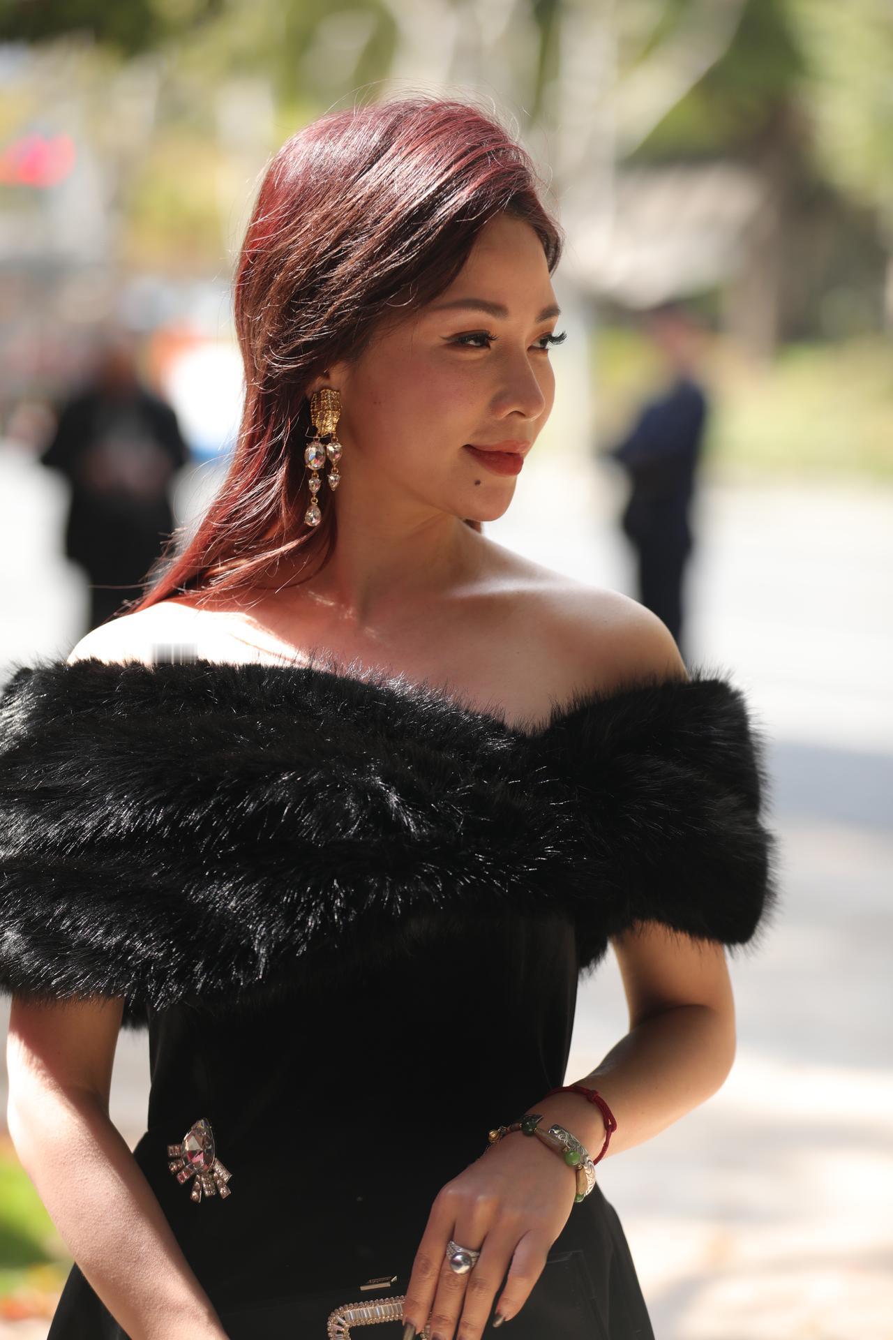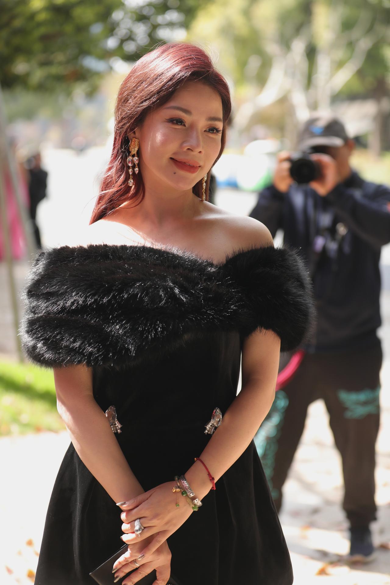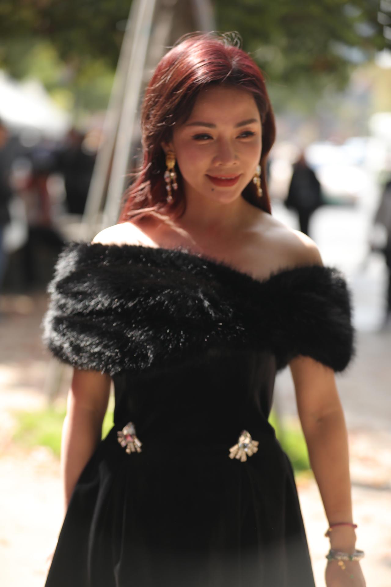 黑色抹胸礼服衬得肌肤胜雪,肩头的黑貂毛披肩随着她的动作轻颤,柔软而贵气。胸前的水晶胸针与耳上的宝石耳饰,在光影中折射出细碎的光芒。