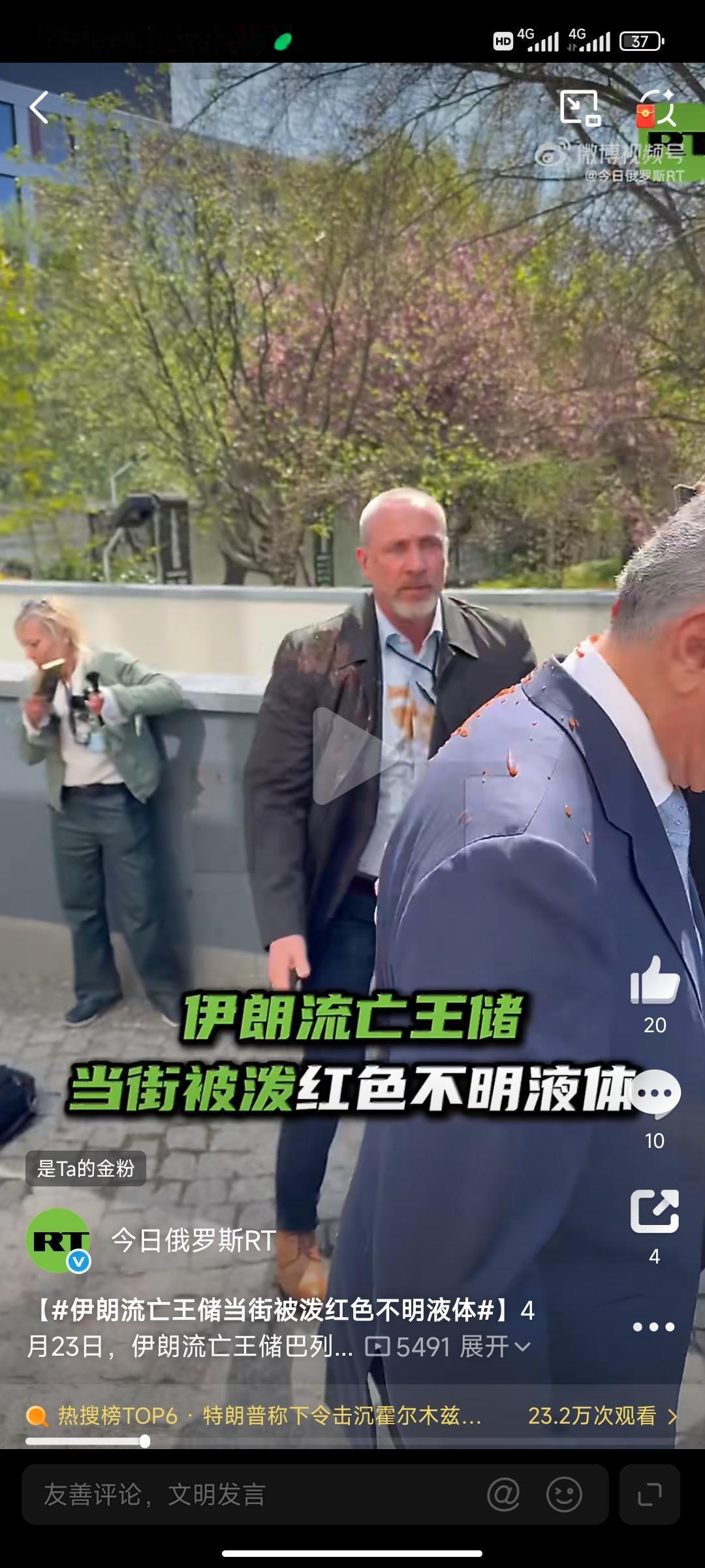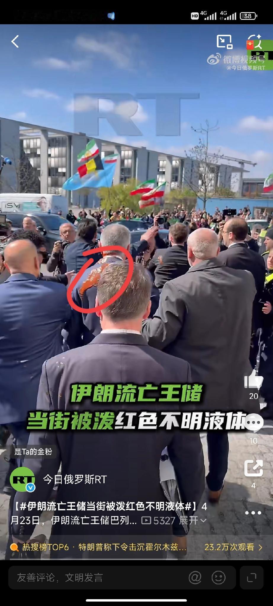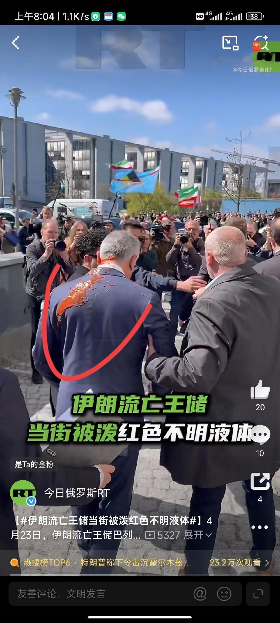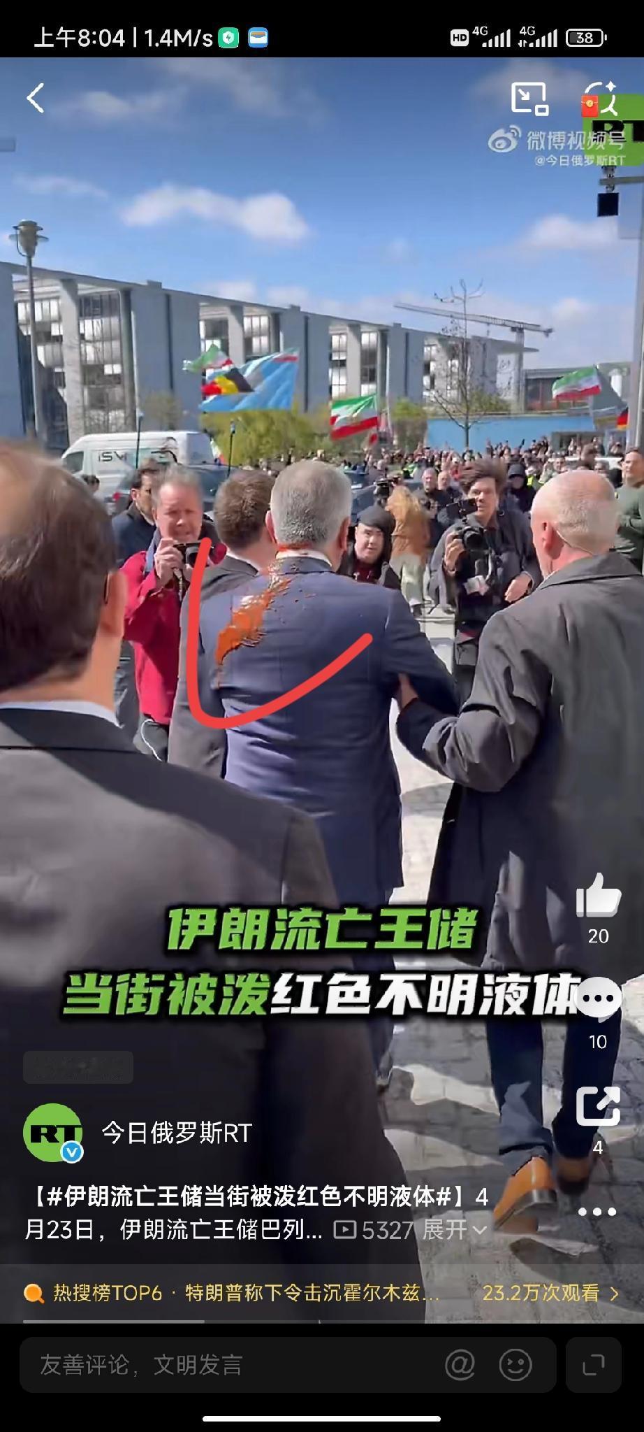 4月23日,伊朗流亡王储巴列维在结束柏林的新闻发布会后,在大楼外遭遇不测,一名不明身份的人,手拿一盆红色不明液体泼向王储。