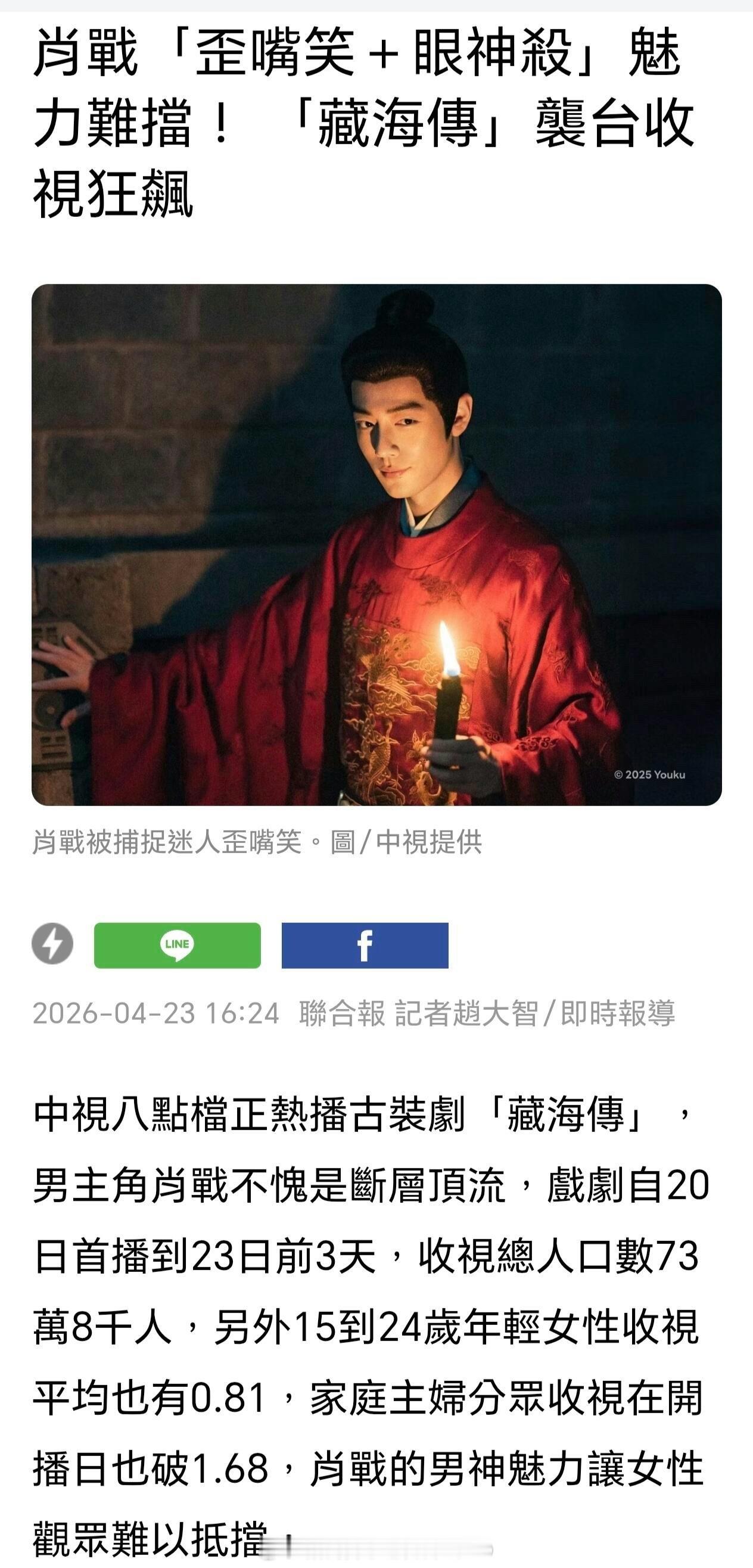 台湾纸媒报道肖战藏海传,在台湾三大台之一的中视电视台播出,男主不愧是断层顶流,收视率一路狂飙前三天收视总人口73万八千,让观众无法抵挡的魅力并称肖战为一线顶流演员、国民男神🔥