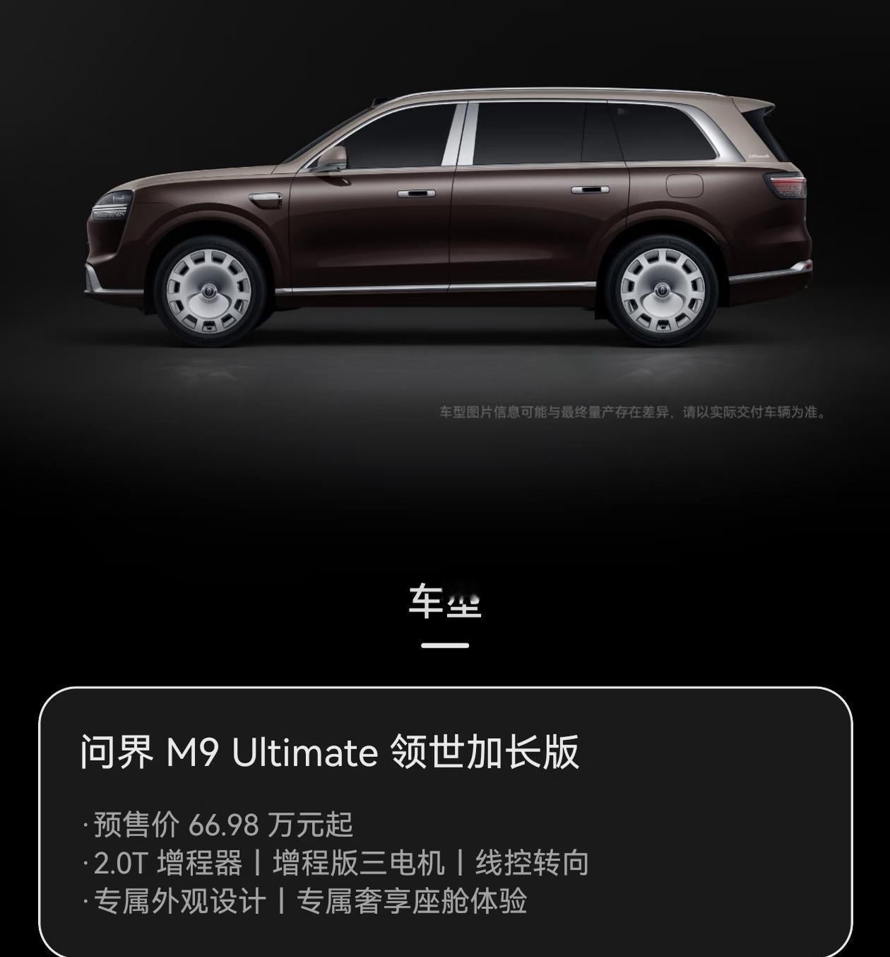 问界 M9 Ultimate 领世加长版 66.98万元起,搭载2.0T 增程器,增程版三电机,线控转向,专属外观设计,专属奢享座舱体验!