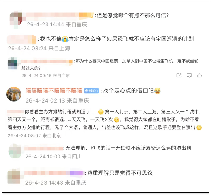 据演唱会主办方4月17日发布的巡演信息显示,Haley Smalls的中国巡演安排为:4月30日北京、5月1日上海、5月3日深圳、5月4日广州,北京站为首站。巡演取消公告发布后,#女歌手因恐飞取消北京巡演#话题词冲上热搜,引发网友热议。4月23日,上游新闻记者以粉丝身份致电主办方上海粉鹿文化传播有限公司。工作人员确认北京站演唱会已取消,原因是艺人没买到高铁票(担心影响接下来的行程),且她不愿意乘坐飞机——她本身恐飞。“北京到上海本来是高铁,没买到票。而且她是欧美人,不太懂什么候补……上海到深圳原计划是坐飞机,她让我们取消,改乘7个半小时的高铁。”工作人员表示,国内其他站的演出行程Haley Smalls都要求改成了高铁,“我们也理解她的理由。”综合:南都官微运营部 另据上游新闻