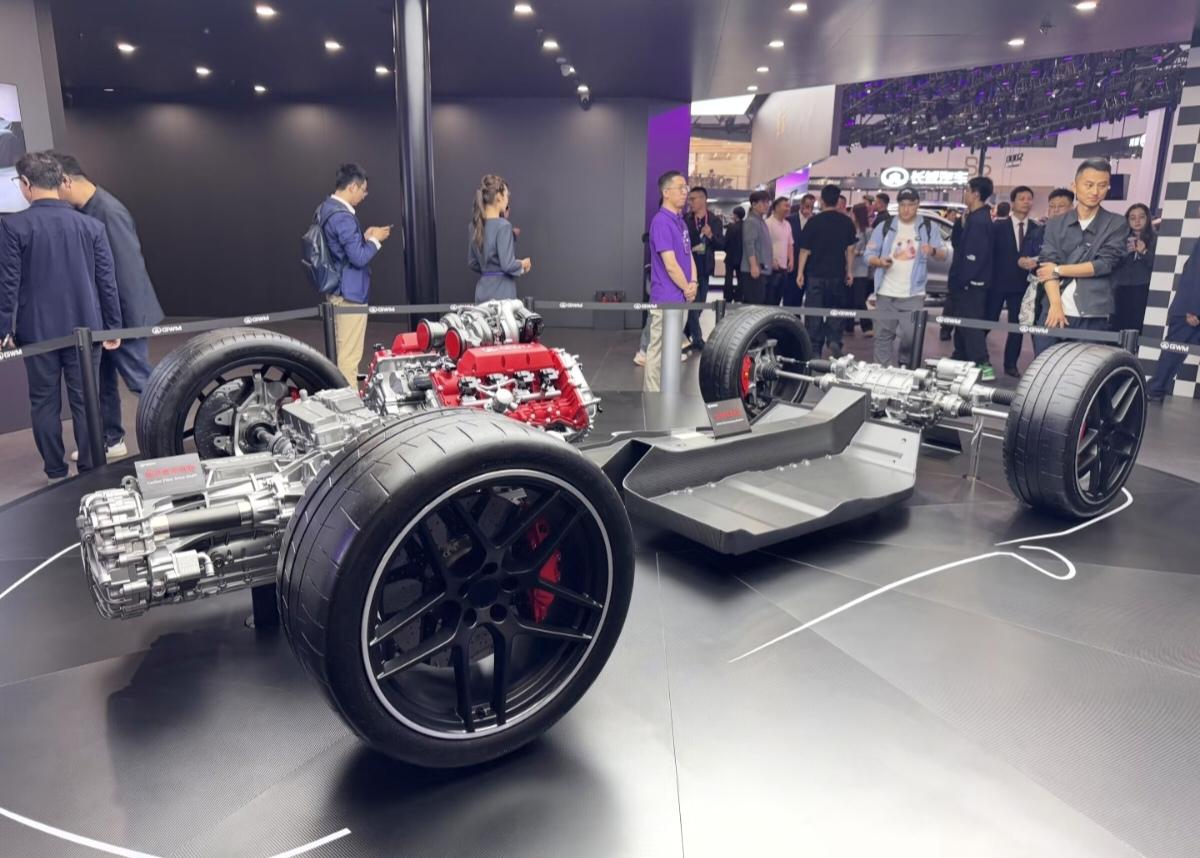 这台4.0T V8双涡轮增压发动机是核心亮点,采用“Hot V”布局,最大功率549马力,峰值扭矩770牛·米,热效率达38%,可兼容92号汽油,在V8领域实现了性能与经济性的平衡。搭配混动系统后,综合功率有望突破1000马力,目标实现2.5秒级百公里加速,极速超350km/h,性能对标国际顶级超跑。同时,底盘采用碳纤维单体壳车身与赛道级悬架设计,搭配碳陶刹车系统,为赛道级操控提供支撑。