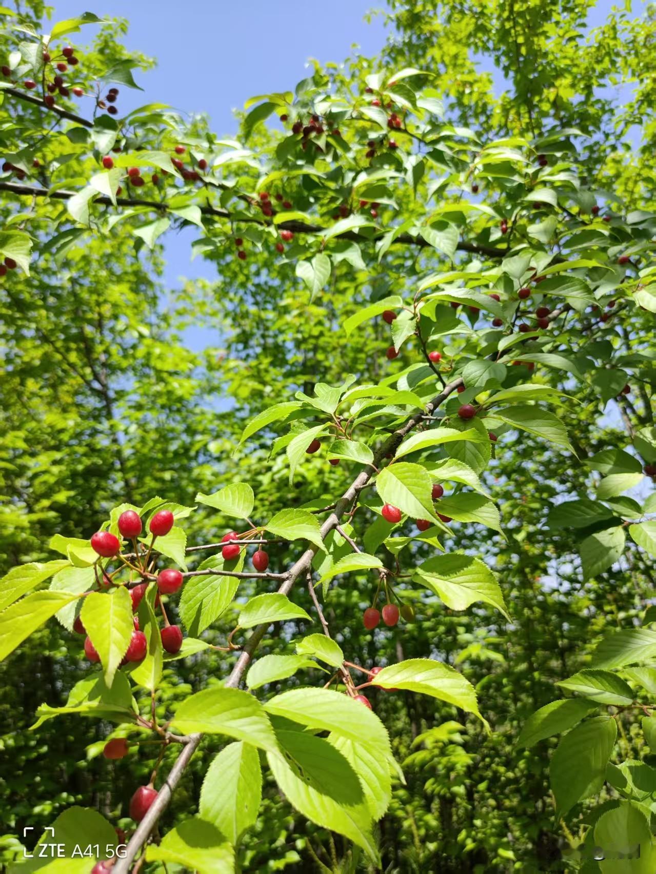 满山遍野,红的红、白的白,既有槐花扑鼻的清香,又有映入眼帘的樱桃,秀色可餐。