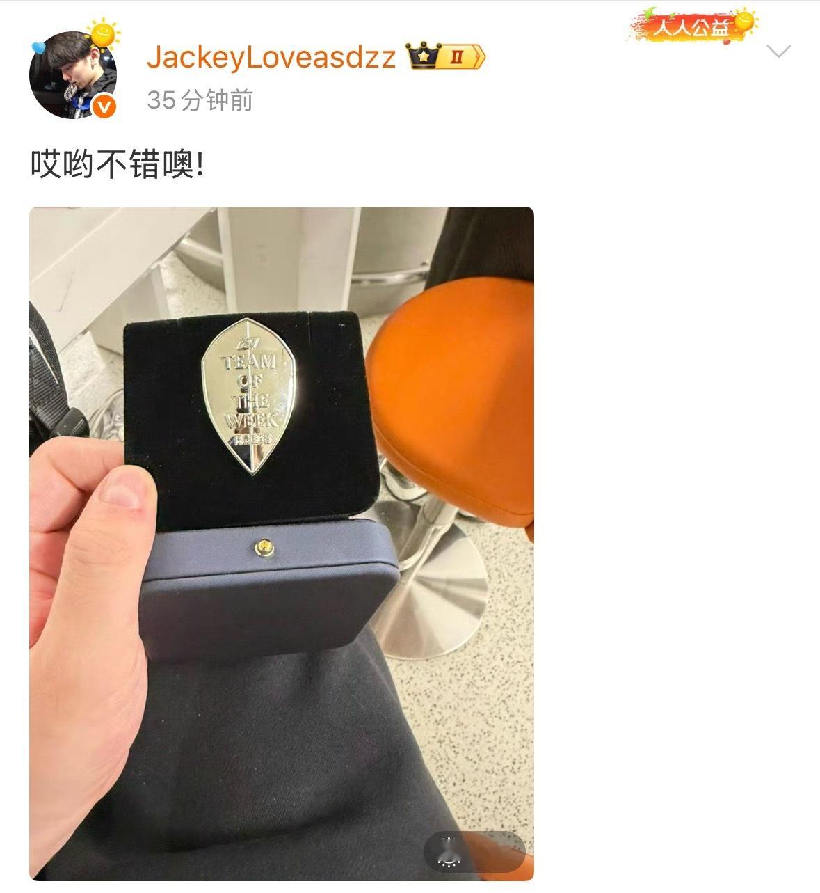 JackeyLove晒周最佳选手徽章JackeyLove晒出周最佳选手徽章,并配文:哎哟不错噢!