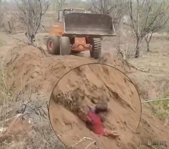 4月16日,山西省忻州市代县水峪村一处果园里上演惊人一幕:一辆铲车来回开动,将地上的黄土推送到地头的坑洼里,而一个头戴帽子穿着红上衣的男子,正被这些黄土掩埋,发出凄厉的喊叫声。