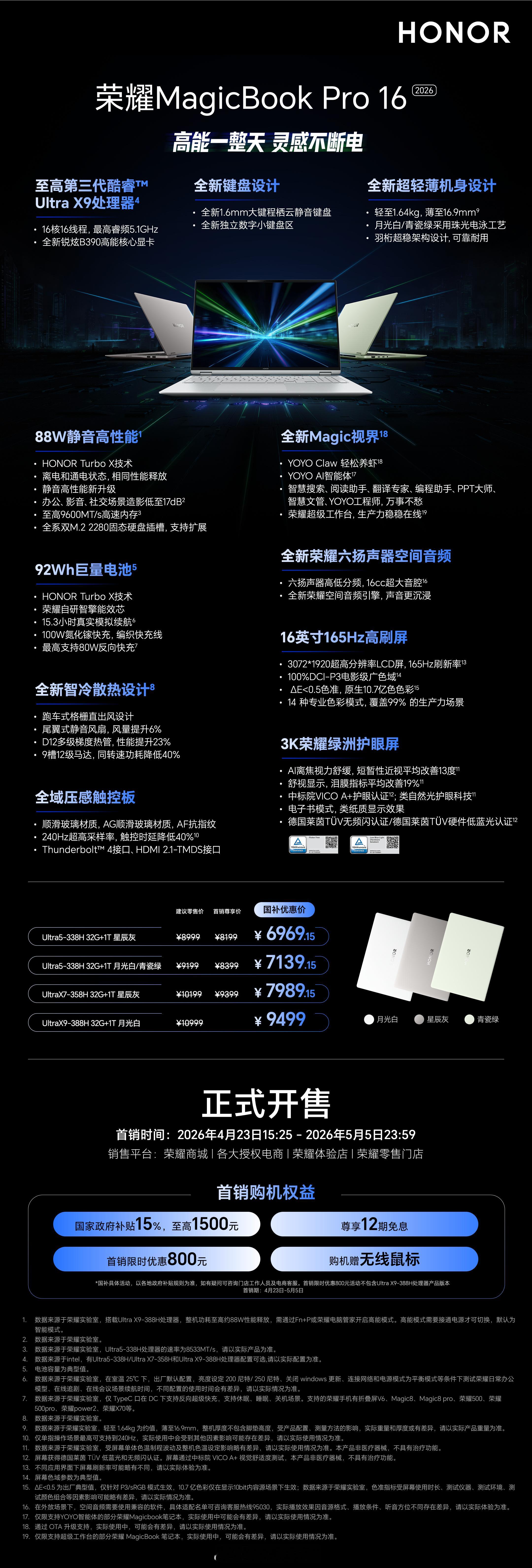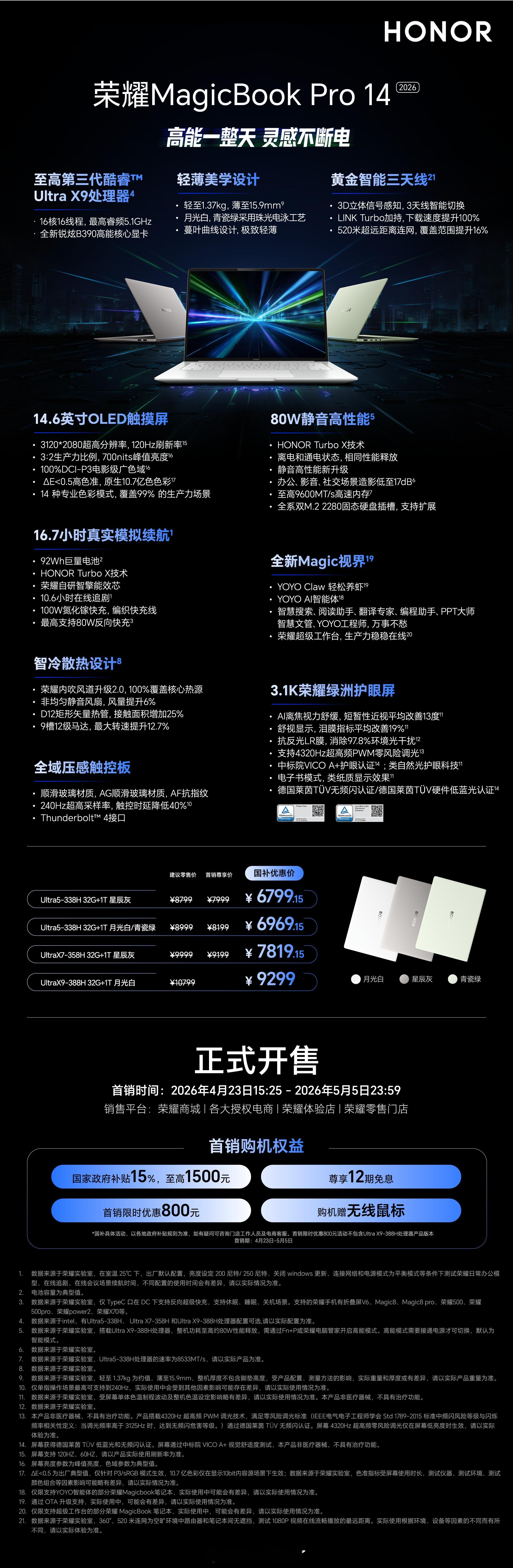 2️⃣. 荣耀 MagicBook Pro 系列 (14 / 16):全能旗舰共性“Pro”属性-核心动力: 搭载第 3 代英特尔酷睿 Ultra 处理器,配合 HONOR Turbo X 调校。-续航充电: 92Wh 电池(最高 16.7 小时续航),100W 氮化镓快充,支持 80W 反向快充(合盖即变充电宝)。-交互接口: 全系标配玻璃压感触控板、雷电 4 接口、Magic 视界交互及 YOYO Claw。机型差异化-Pro 16: 3K 分辨率 + 165Hz 高刷电竞屏,内置六扬声器空间音频。-Pro 14: 旗舰级 OLED 屏幕,配有 LR 抗反光膜,无惧强光环境。