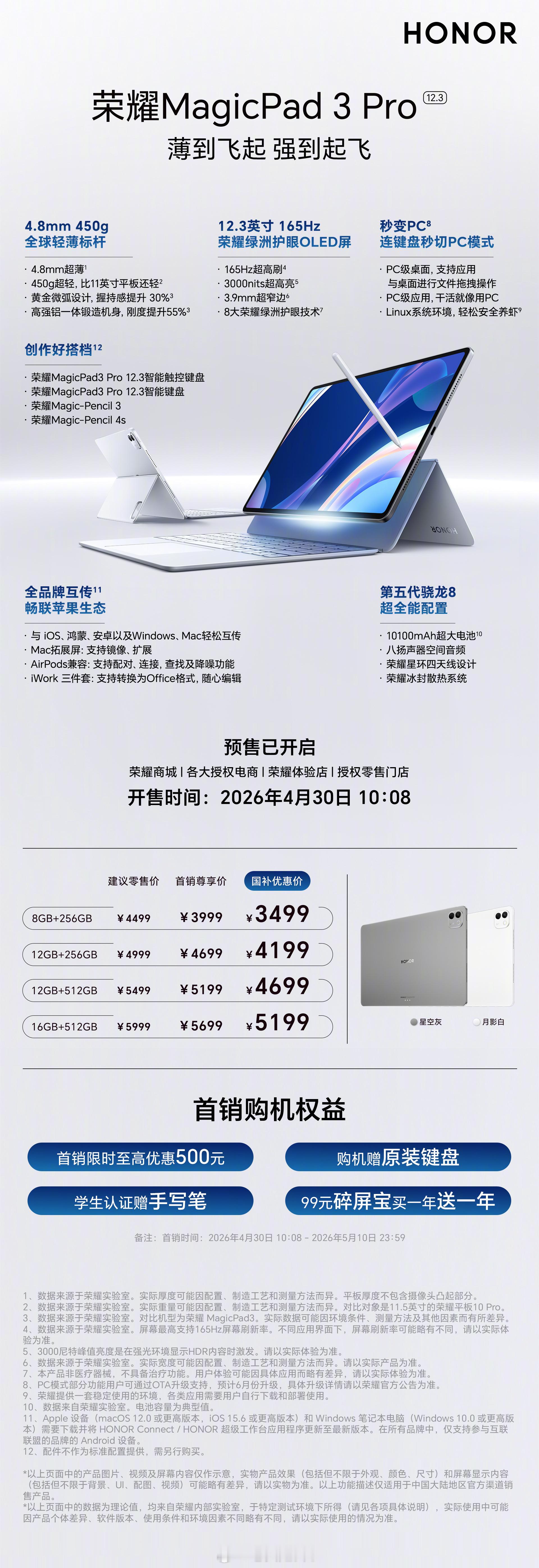 4️⃣. 荣耀 MagicPad 3 Pro:生产力平板-极致工艺: 4.8mm 厚度,450g 重量;高强铝一体工艺与航天级纤维材料,黄金微弧手感。-顶尖配置:屏幕: 12.3 英寸 165Hz 高刷 OLED 护眼屏。芯片: 第五代骁龙 8 旗舰芯片。外设: 10100mAh 电池、8 扬声器(空间音频)、荣耀星环四天线。-交互体验: 支持 PC 模式,可实现 PC 级专业办公交互。
