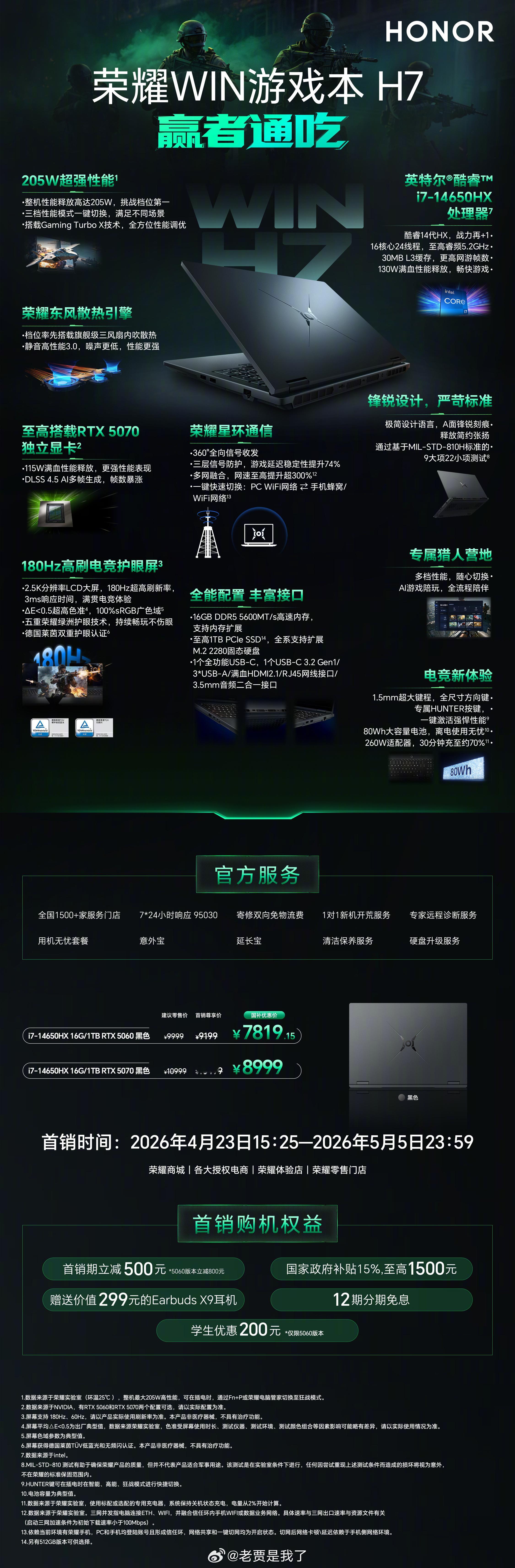 今天荣耀的新品好多,既有游戏本又有轻薄本和平板产品,给大家整理了一下,方便大家选购。荣耀WIN游戏本1️⃣. 荣耀 WIN 游戏本系列:性能巨兽H9:操控与氛围专家-交互设计: 1.5mm 电竞级按键,高精度触控板,手感利落。-性能管理: 支持一键切换五大模式(至尊狂战、狂战、高静、智能、自定义)。-个性化: 专属视觉形象与灯效联动,沉浸感十足。-扩展性: 全量接口适配,具备双扩展槽位,支持灵活升级。H7:硬核性能标杆-核心配置: 第 14 代酷睿 HX 处理器 + RTX 5070 显卡。-散热释放: 东风散热引擎,整机性能释放至高可达 205W。-屏幕素质: 180Hz 高刷护眼屏,通过双重护眼认证。-优化技术: Gaming Turbo X 调校,大幅提升网络响应速度。