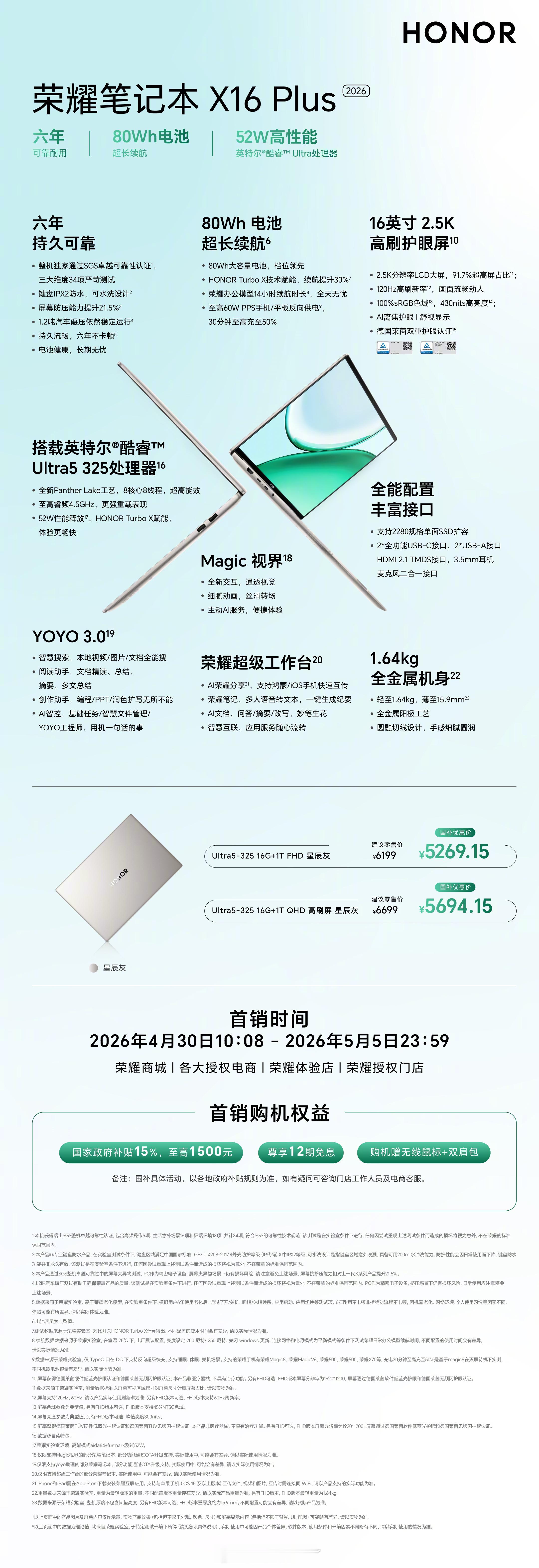 3️⃣. 荣耀笔记本 X Plus 系列:可靠 AI 伙伴-品质认证: 行业首个 SGS 卓越可靠性认证,轻薄且坚固。-硬件效能: 英特尔酷睿 Ultra 5 处理器 (325),主打 AI 算力与多任务处理。-持久电力: 80Wh 同档位大容量电池。