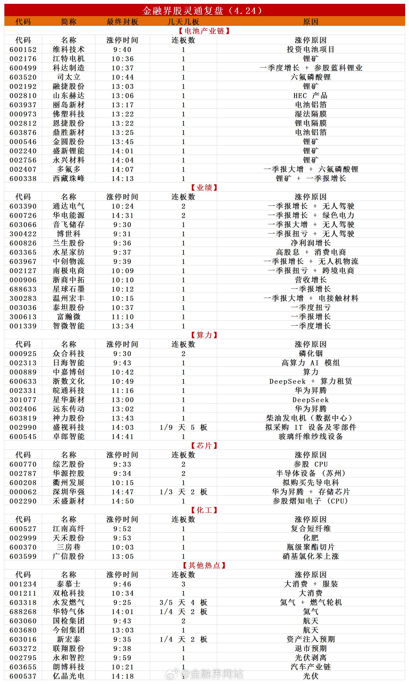 【涨停复盘:“光”太耀眼,新易盛501亿天量成交大跌11%!锂矿坚守不“离弃”,盛新锂能、江特电机、西藏珠峰涨停】 4月24日短线情绪低迷,超3300股下跌,20股跌停,连板高度降至3连板。板块方面,算力产业链调整(新易盛大跌超11%,成交额501亿居A股历史第四);锂矿概念爆发(多股涨停);芯片产业链拉升、化工板块活跃(均有多股涨停)。商业航天概念调整、算力硬件走弱。指数上,沪指跌0.33%,深成指跌0.69%,创业板指跌1.41%,沪深成交额2.64万亿缩量1626亿。当日59股涨停,连板8只,封板率75%,焦点股如盛视科技9天5板等。相关热点:广东高纯氦气价格大涨;黑磷快充电池技术突破;算力租赁支持DeepSeekV4;国家电网规划采购具身智能设备推动运维转型。详情:涨停复盘:“光”太耀眼,新易盛501亿天量成交大跌11%!锂矿坚守不“离弃”,盛新锂能、江特电机、西藏珠峰涨停