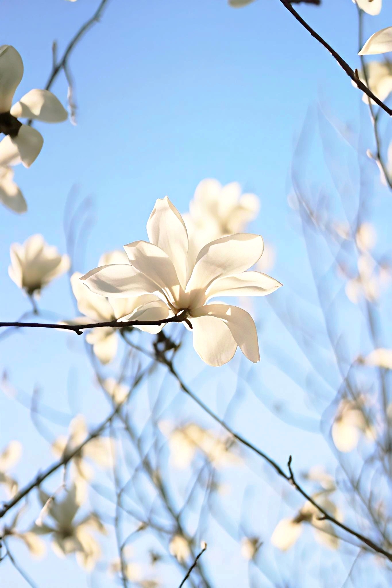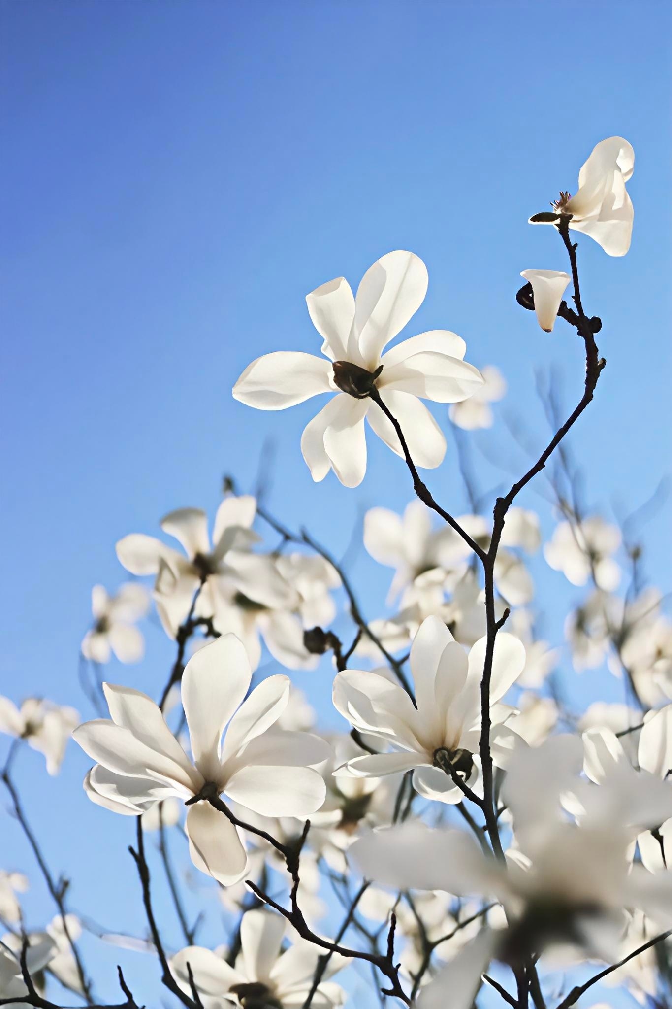 走路途中撞见一树白玉兰,在澄澈蓝天的映衬下静静绽放花瓣润莹洁白,温柔又舒展,微风
