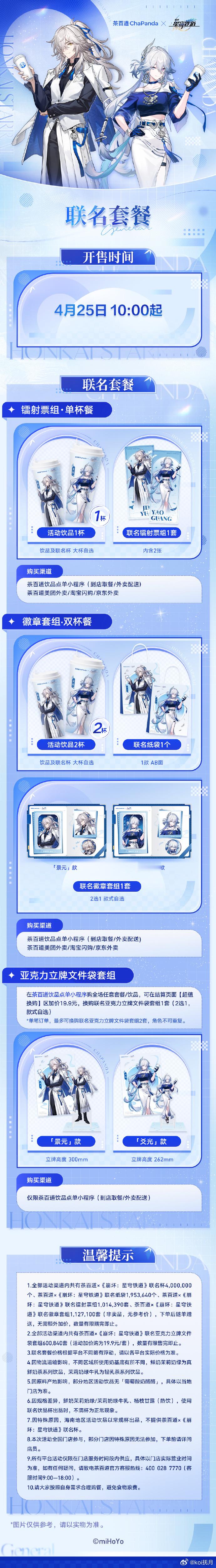 崩坏星穹铁道茶百道星穹铁道联名将军请喝茶开拓者狂喜!盼了好久的第二次联动终于来啦,4.24正式上线,一篇精简看懂怎么买、怎么不踩雷👇一、本次联名核心亮点✅ 6款仙舟主题联名饮品,适配角色口感超贴合✅ 包装:2款联名杯 + 1款双面限定纸袋✅ 周边:镭射票组、金属徽章套组、亚克力立牌+文件袋全套上线二、套餐怎么买|按需对号入座🍵 想要镭射票→直接拍【单杯套餐】一杯联名饮品就送镭射票,单人收藏首选,不浪费。🍵 想要徽章+纸袋→闭眼冲【双杯套餐】两杯饮品+限定纸袋+角色徽章套组,和朋友拼单最划算。🍵 周边All in党→选多杯搭配+加价换购亚克力立牌文件袋仅小程序加价换购,想要全套一次性集齐不纠结。三、周边质感|这次诚意真的拉满二次联动明显升级:镭射票幻彩镭射质感高级、徽章金属工艺精致耐看,亚克力立牌+文件袋实用又好看,用料做工比上次用心太多!四、打卡重点📍全国1家旗舰店+36家主题门店,氛围感超好适合拍照打卡💡热门门店建议提前小程序预约,减少排队⚠️周边限量赠完即止,认准官方渠道,别买错套餐!终于等到将军请喝茶,星铁玩家速冲,喜欢周边和饮品的千万别错过这次联名~