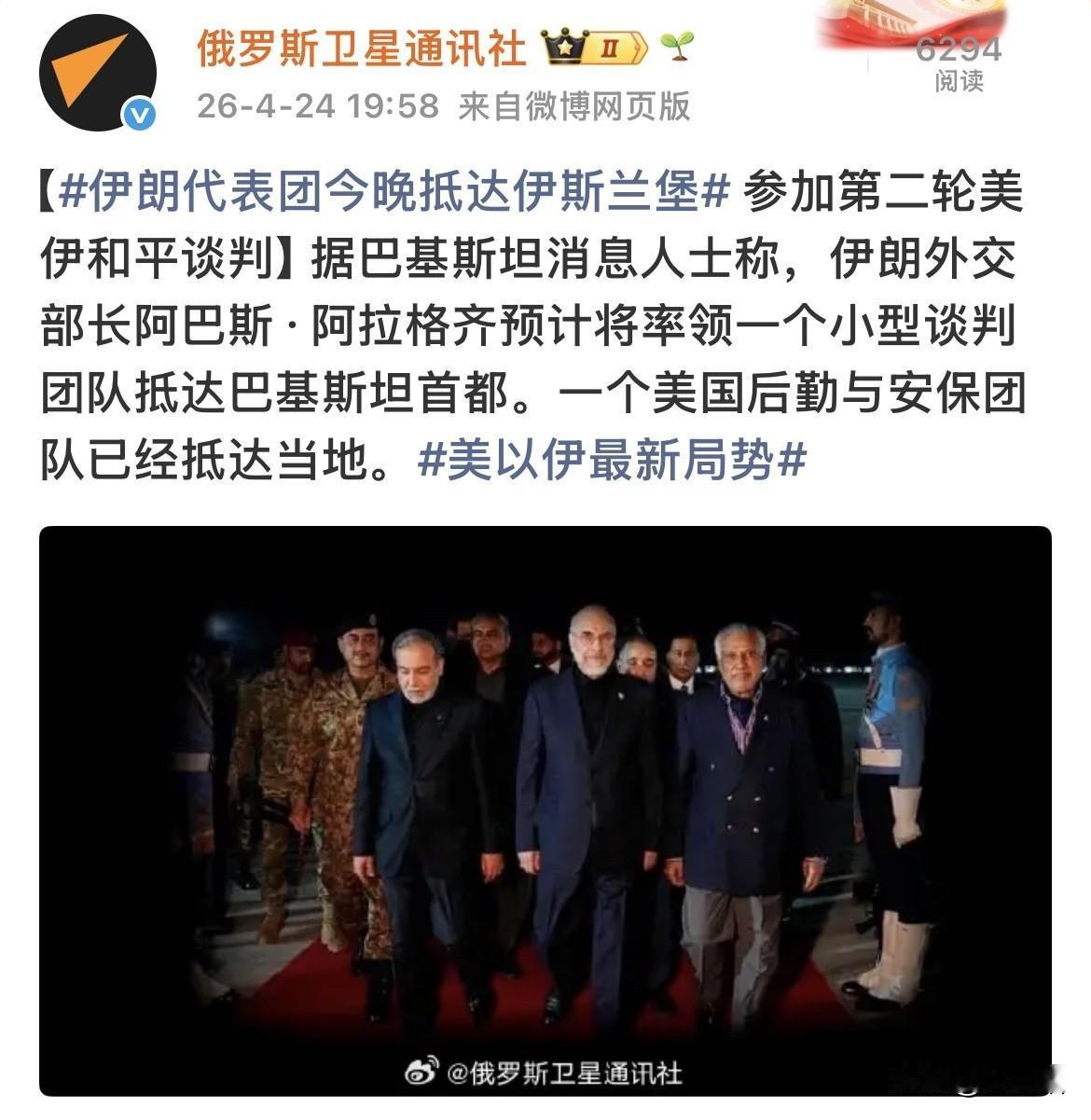 据《俄罗斯卫星通讯社》援引巴基斯坦消息,伊朗外交部长阿巴斯•阿拉格齐已经率团抵达巴基斯坦首都伊斯兰堡。看来伊朗已同意与美国进行新一轮的谈判。