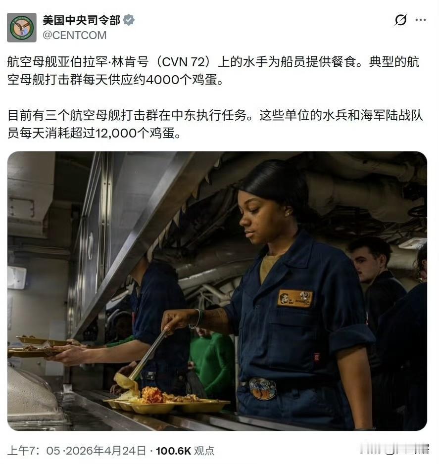 美军中央司令部发文表示,一个航母打击群每天有4000个鸡蛋的供应量,三个航母打击群每天消耗超过12000个鸡蛋。按一艘航母配置5000人计算,差不多达到0.8个鸡蛋/人。