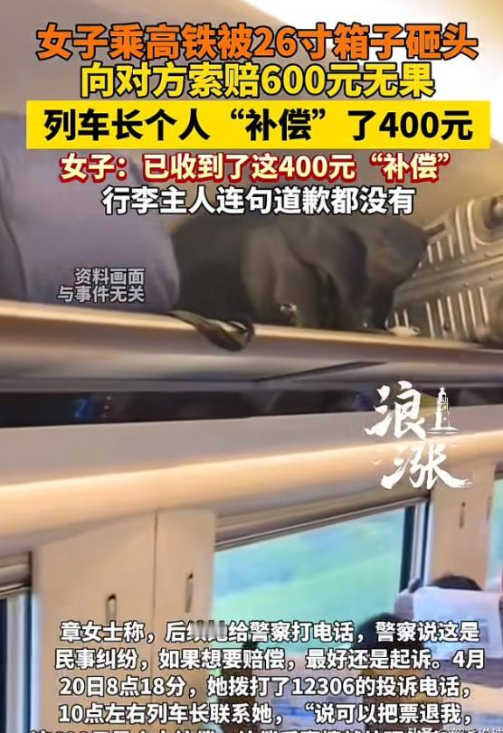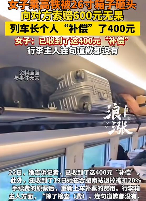 江苏南京,一大学生乘坐高铁去旅游,上车后,突然从头顶上坠落一26寸行李箱,女子被砸的头晕眼花,疼痛难忍,眼泪止不住的往下流。事后,行李箱主人没有逃避责任,主动带女大学生去医院,并承担了医药费,好在,医生告知是皮外伤,并无大碍。对方提出给女大学生100元了事。女大学生不干了,认为对方连个道歉都没有,给100元太少了,提出要600元的补偿。对方怒怼:远超自己的范围,想讹人找铁路部门去,不要揪着自己不放。