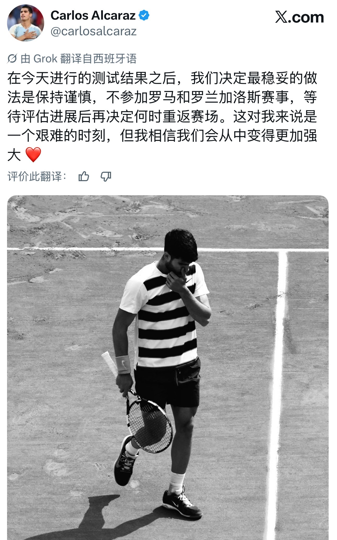 阿尔卡拉斯宣布退出罗马大师赛和法网!💥