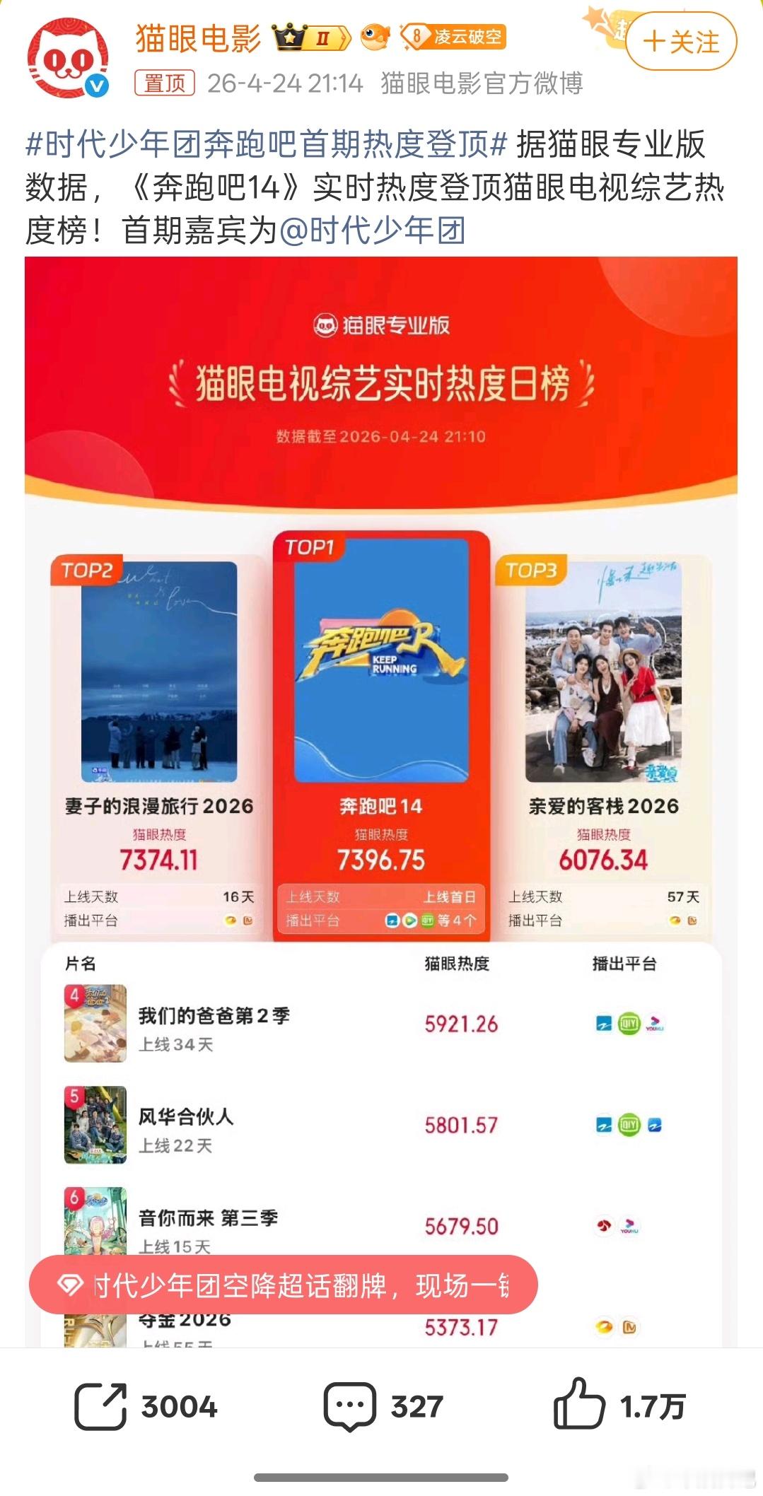 时代少年团奔跑吧首期热度登顶2026年4月24日,《奔跑吧14》首期播出,直接登顶猫眼电视综艺热度榜榜首,卫视同时段收视率也拿下第一。事情的起因,是节目组请来了成团七年首次全员合体的时代少年团,完成了一次国民综艺与顶流团体的强强联手。《奔跑吧》走到第14季,早已陷入了长红综艺的内容瓶颈。老观众对固定模式审美疲劳,新观众又很难被吸引。而时代少年团的加入,给这档老综艺,注入了全新的青春活力。节目组也精准踩中了观众的喜好,创新7V7黄蓝阵营对决模式,把竞技感和戏剧张力直接拉满。经典的撕名牌环节升级AR虚拟技术,既保留了观众的情怀,又玩出了新花样。李晨、沙溢这些跑男家族的成员稳重控场,少年们元气鲜活、敢拼敢玩,两种气场碰撞在一起,没有尴尬的硬聊,只有自然的笑点和拉满的综艺感。这次热度登顶,也给长红综艺指了一条明路。找对契合的嘉宾,打磨有新意的内容,老IP,也能玩出新的生命力。时代少年团奔跑吧首期热度登顶