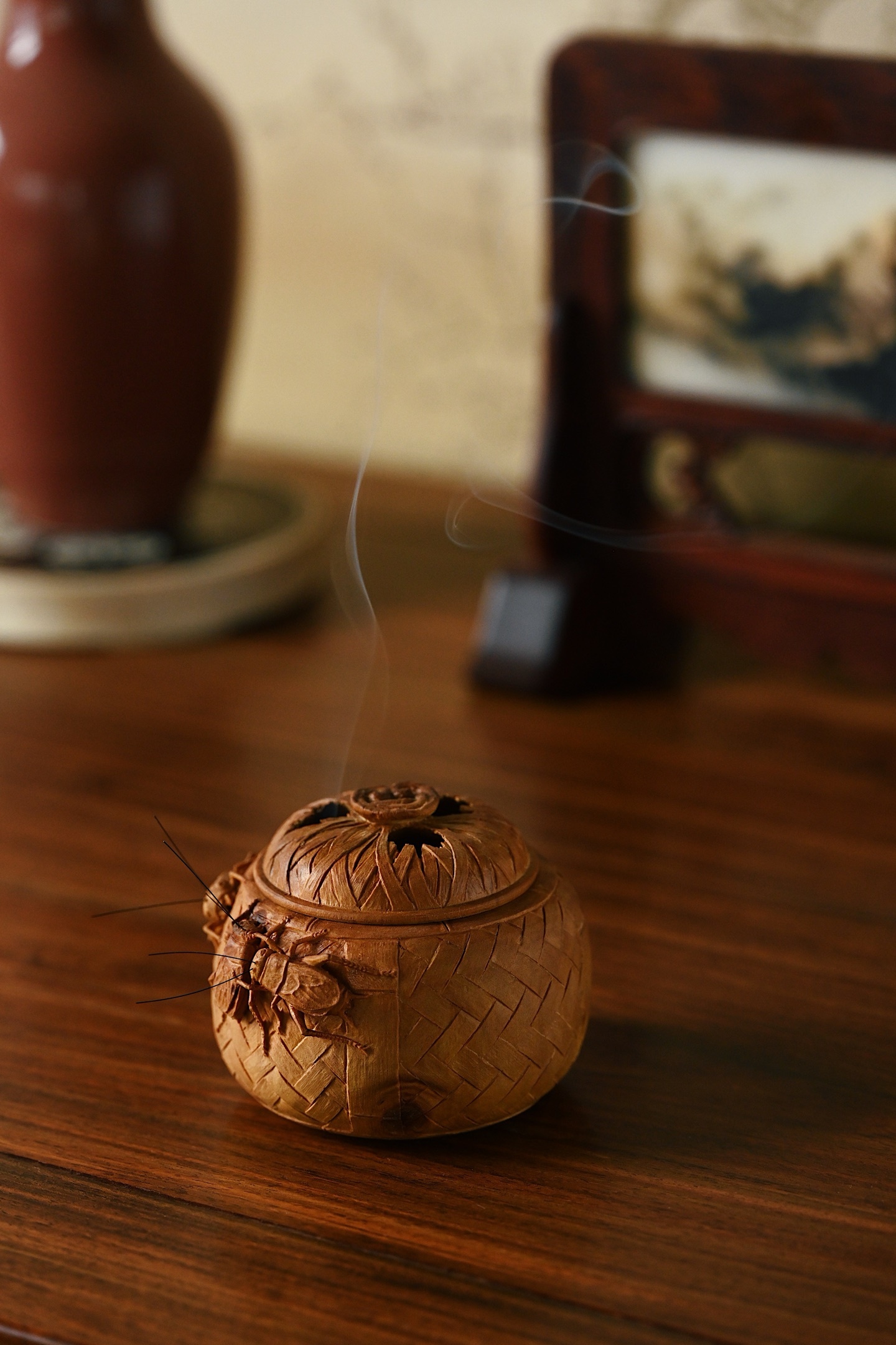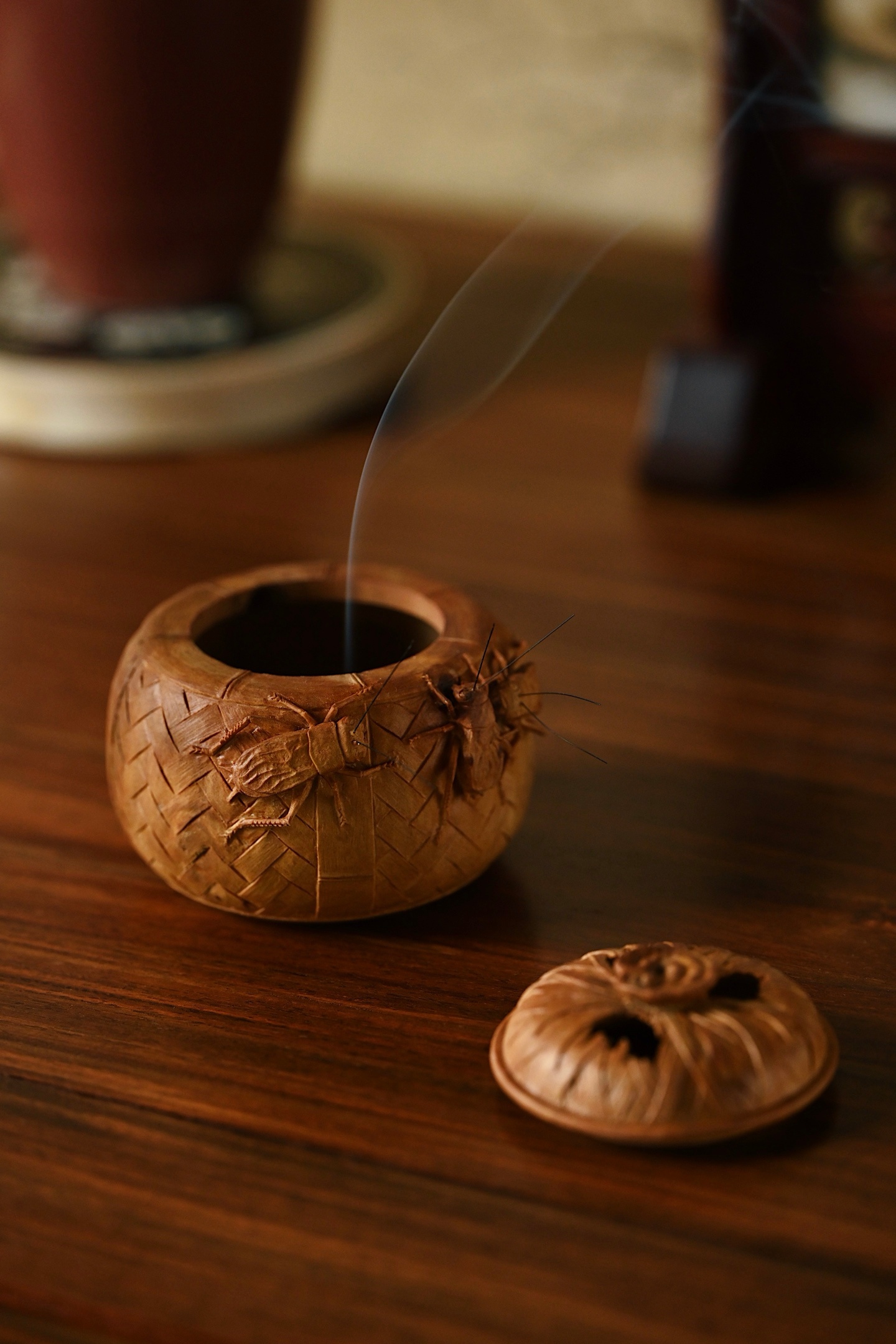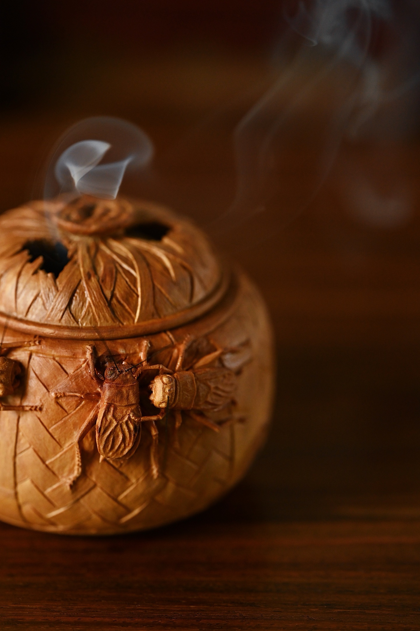 以竹篓为形,以蟋蟀为饰,将乡野秋趣凝于方寸。炉身竹编纹理细密如织,蟋蟀触须纤长灵动,仿佛在竹篓间嬉戏。焚香时轻烟袅袅,具文人赏玩的清雅意趣。