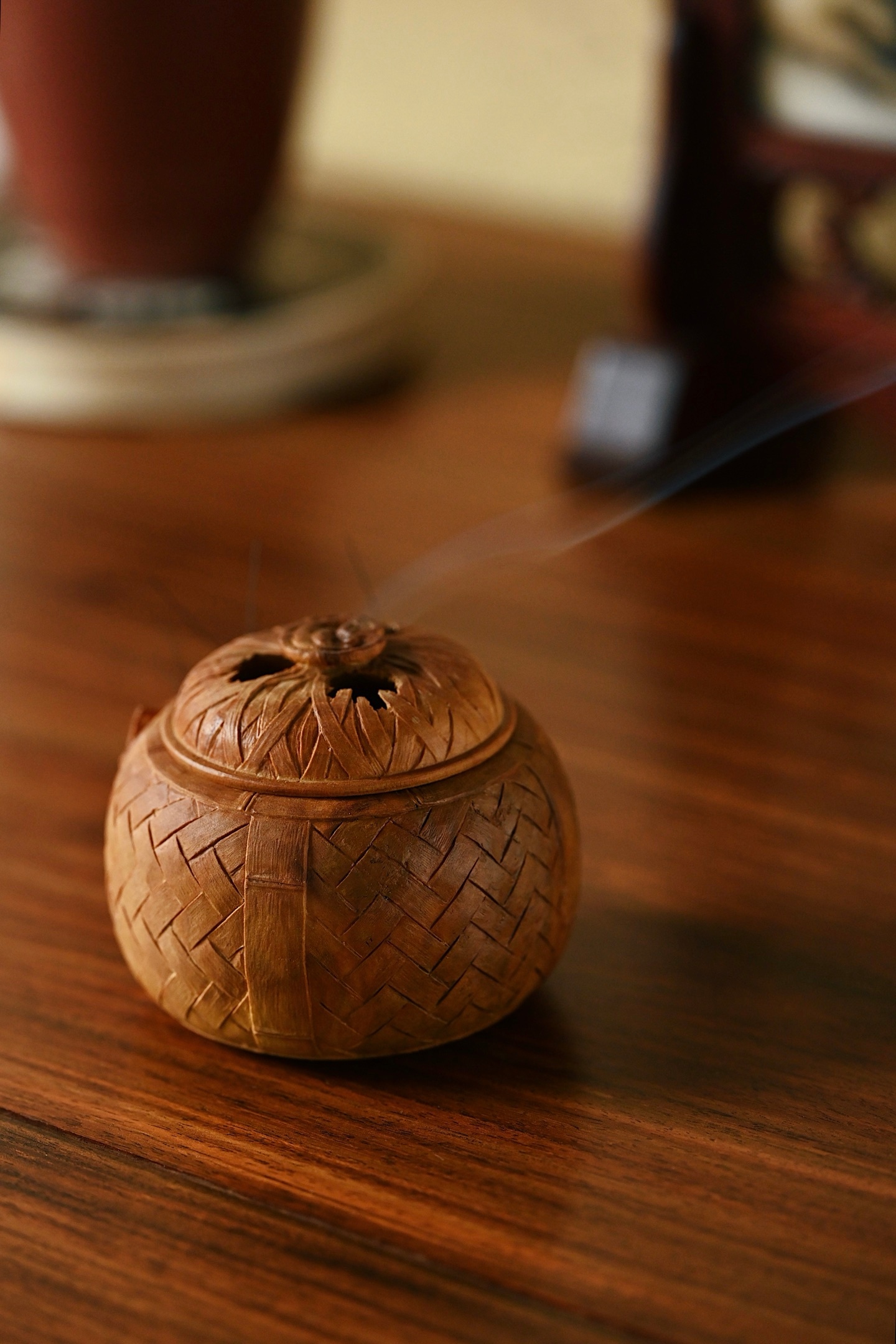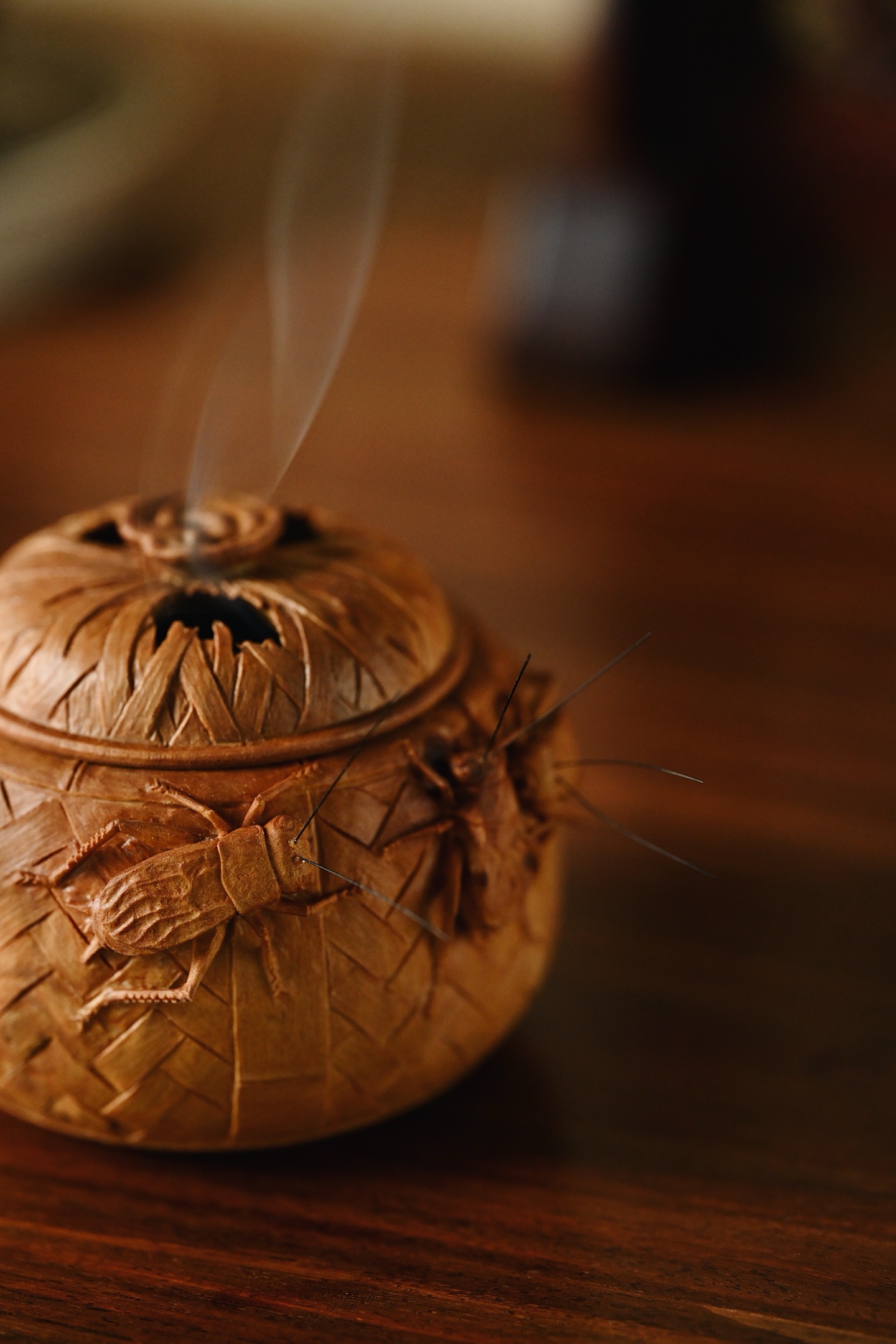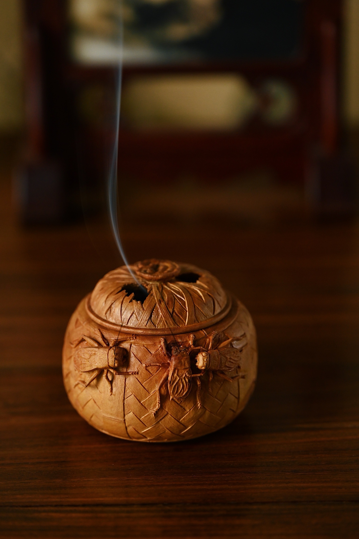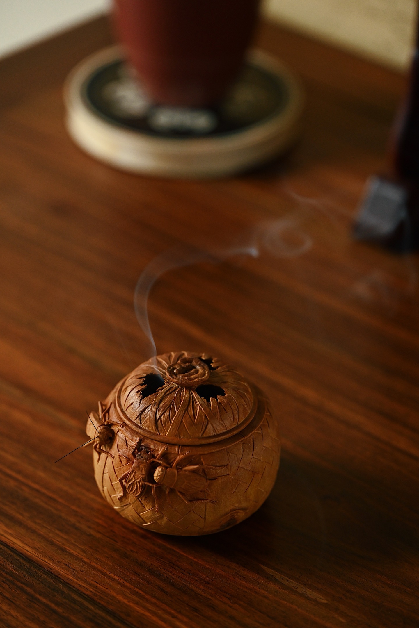 以竹篓为形,以蟋蟀为饰,将乡野秋趣凝于方寸。炉身竹编纹理细密如织,蟋蟀触须纤长灵动,仿佛在竹篓间嬉戏。焚香时轻烟袅袅,具文人赏玩的清雅意趣。