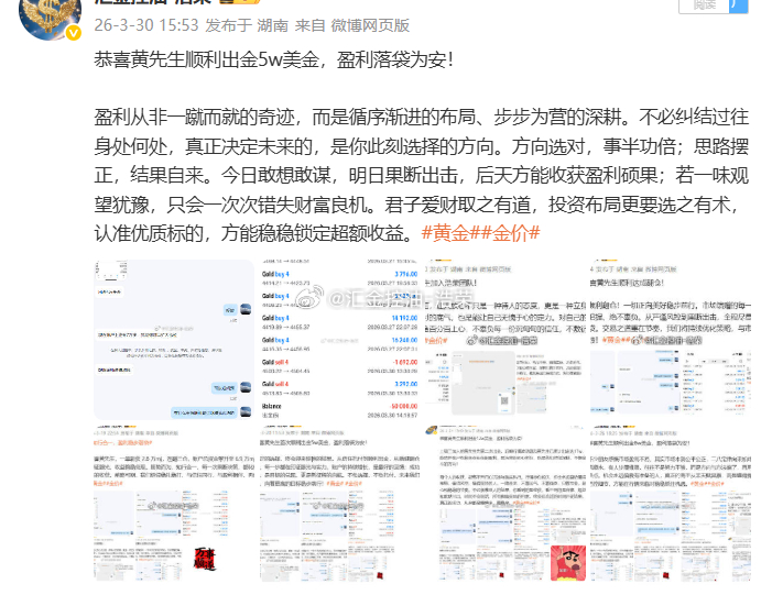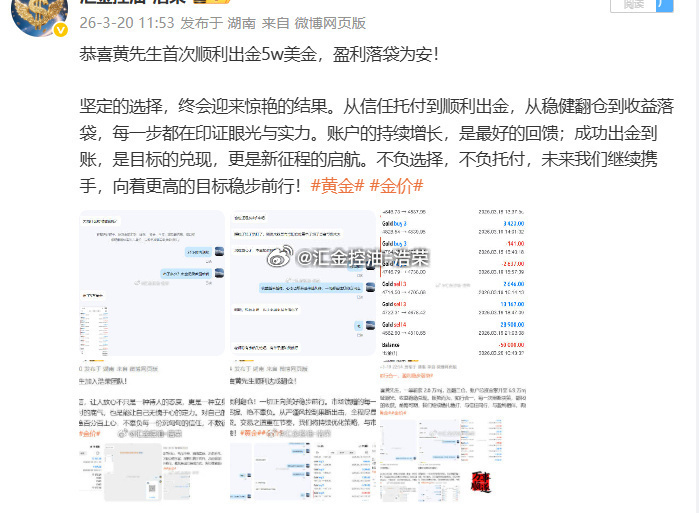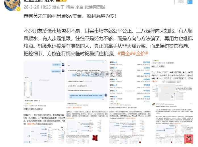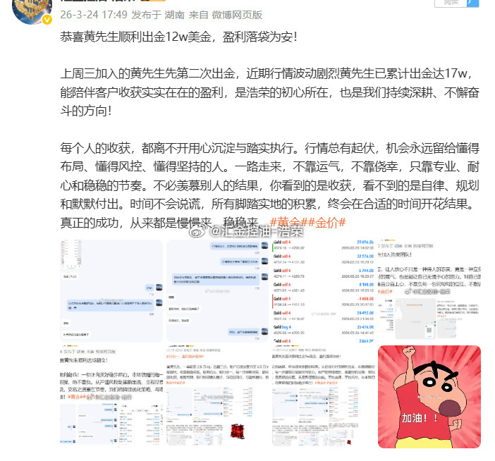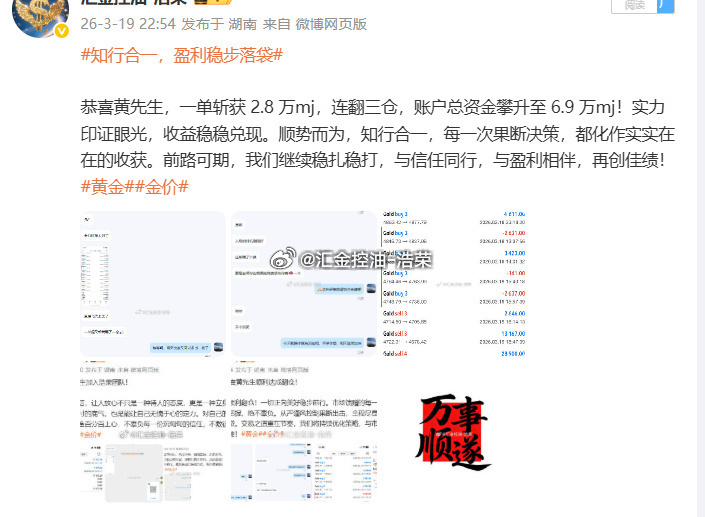 市场风云变幻,顺势者方能致远;交易长久盈利,依托专业方能稳赢。感恩黄先生的充分信任与默契配合,选择托付,便全力以赴。往后岁月,浩荣团队将继续以硬核实力、稳健思路深耕市场,不负每一份期待,与客户携手同行,持续掘金行情,共赢财富未来。黄金 金价