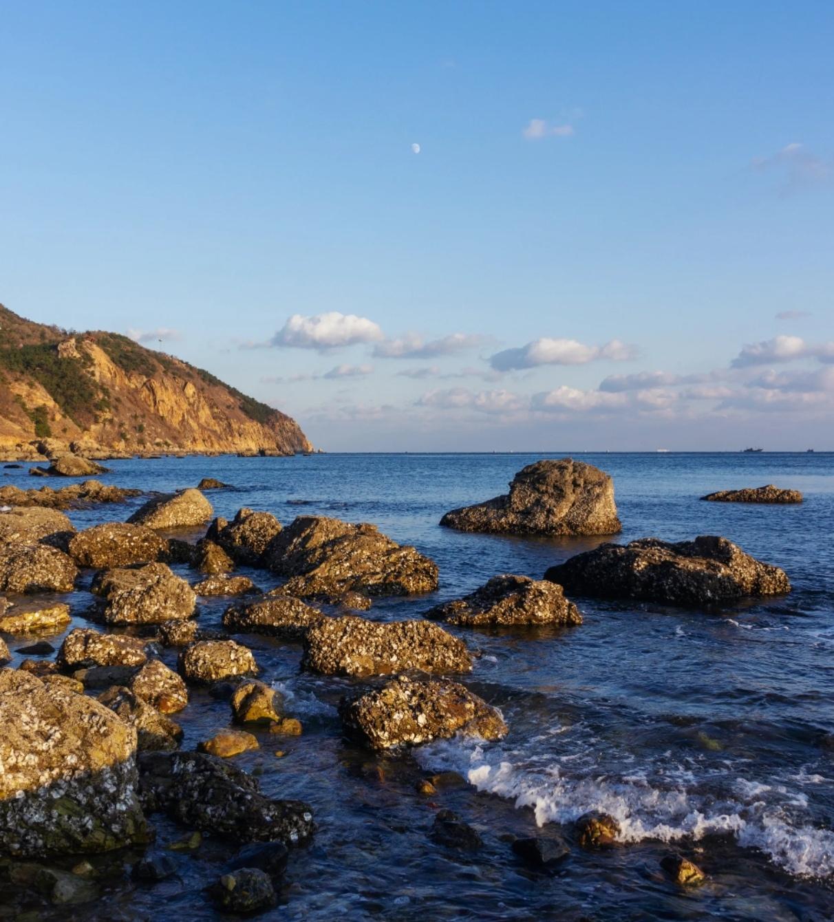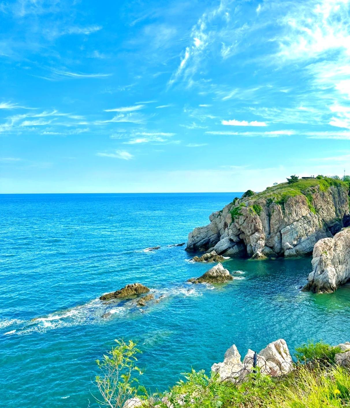 不同于南国海域的热烈喧嚣,这里海岸绵长蜿蜒,礁石错落依偎蔚蓝海面。海风清冽绵长,浪潮轻拍岸滩,山海相依浑然成景。
