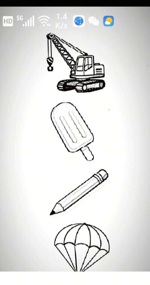 〔看图猜成语〕 图中画面真有趣; 有个吊车和冰糕; 另外还有一铅笔; 降落伞还不
