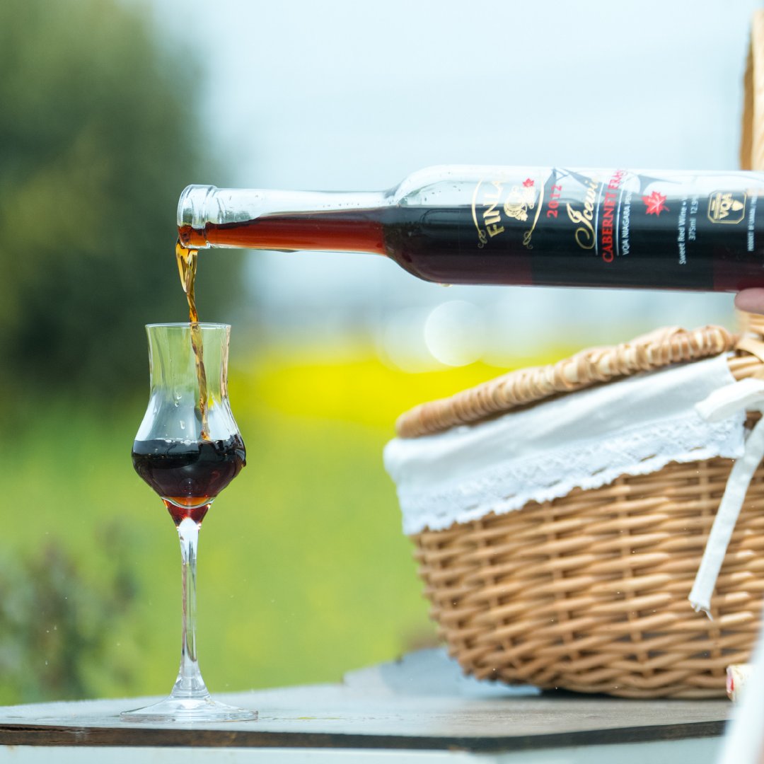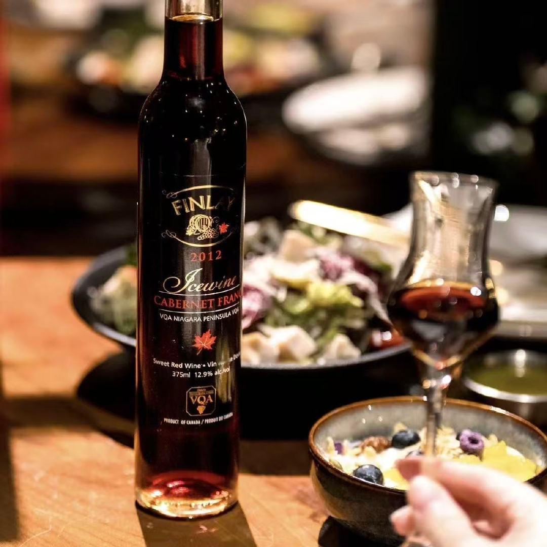 正宗加拿大VQA冰酒,酒标上会标有“Icewine”字样,注意:“Icewine”标识,7个字母必需连在一起,如果写的是分开的“Ice Wine”或“Snow Wine”等等,都不是正统加拿大冰酒。冰酒的最佳饮用温度为4-8度,建议用杯口较小的冰酒杯或郁金香杯,有助于集中香气,冰酒较甜,通常作为餐后甜酒。弗兰尼品丽珠冰红葡萄酒 12.9%vol 375ml