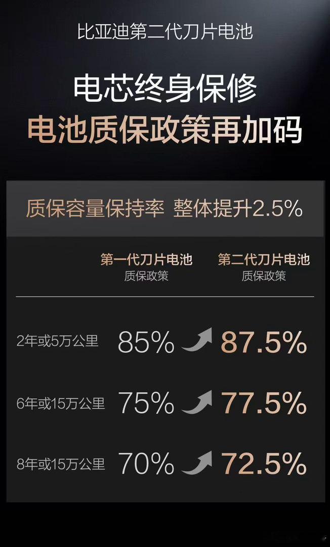 而且比亚迪这波质保政策真的太有诚意了,直接加码升级!相比第一代,容量保持率整体提升了2.5%,6年或15万公里内,只要电池容量低于77.5%就能免费包换,电芯还能终身保修,有这样的承诺,真的太让人安心了。