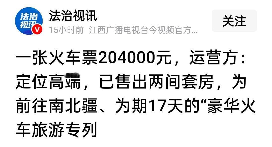 有眼尖的网友在平台里发现了一趟17天的“豪华火车旅游专列”,价格直接飙到了20.4万/人,让人看了一脸懵:我到底是买了张火车票,还是买了一套带轮子的小公寓?