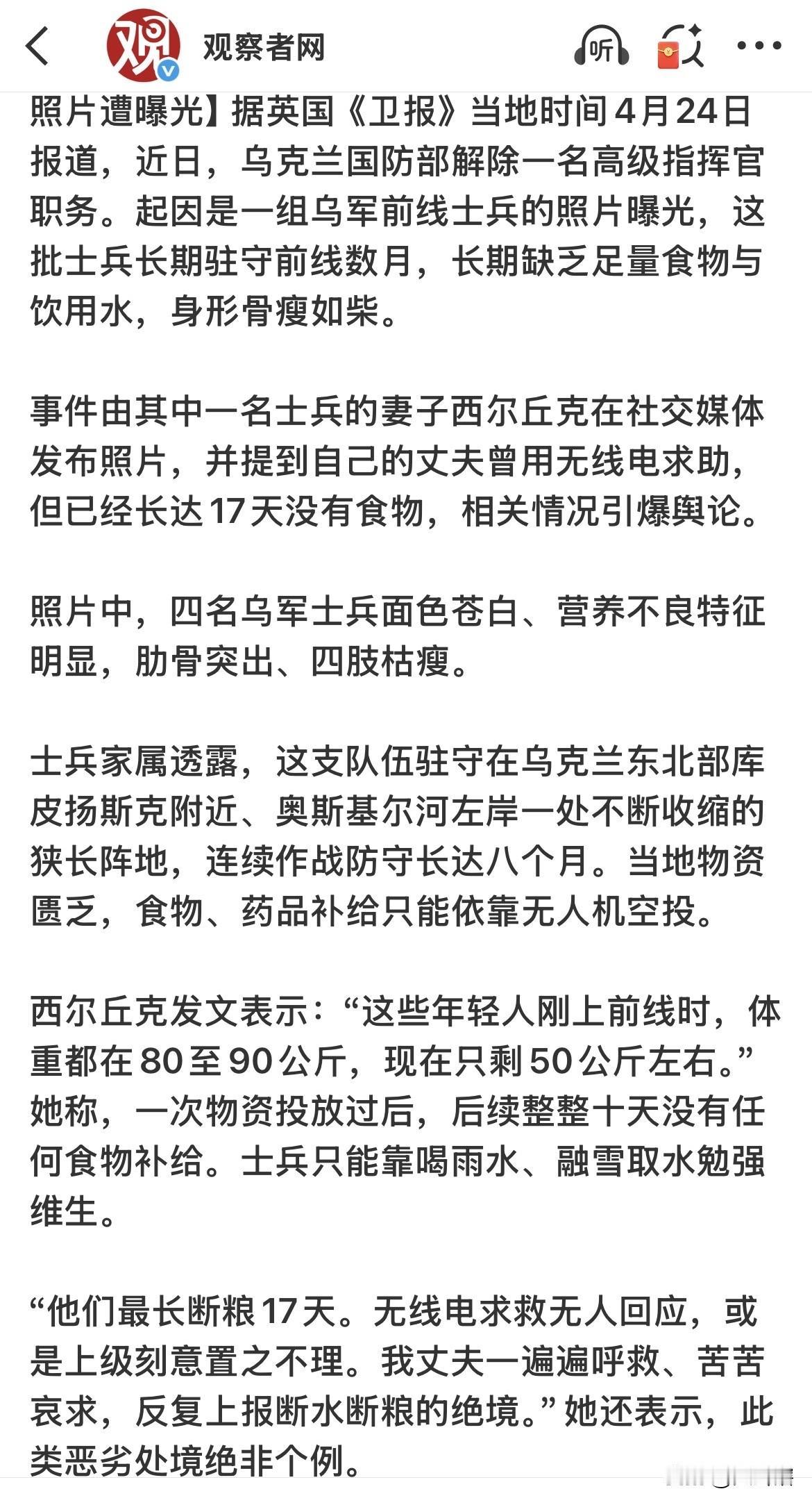 【外媒称乌军士兵断粮17天,仅靠雨水、融雪续命】