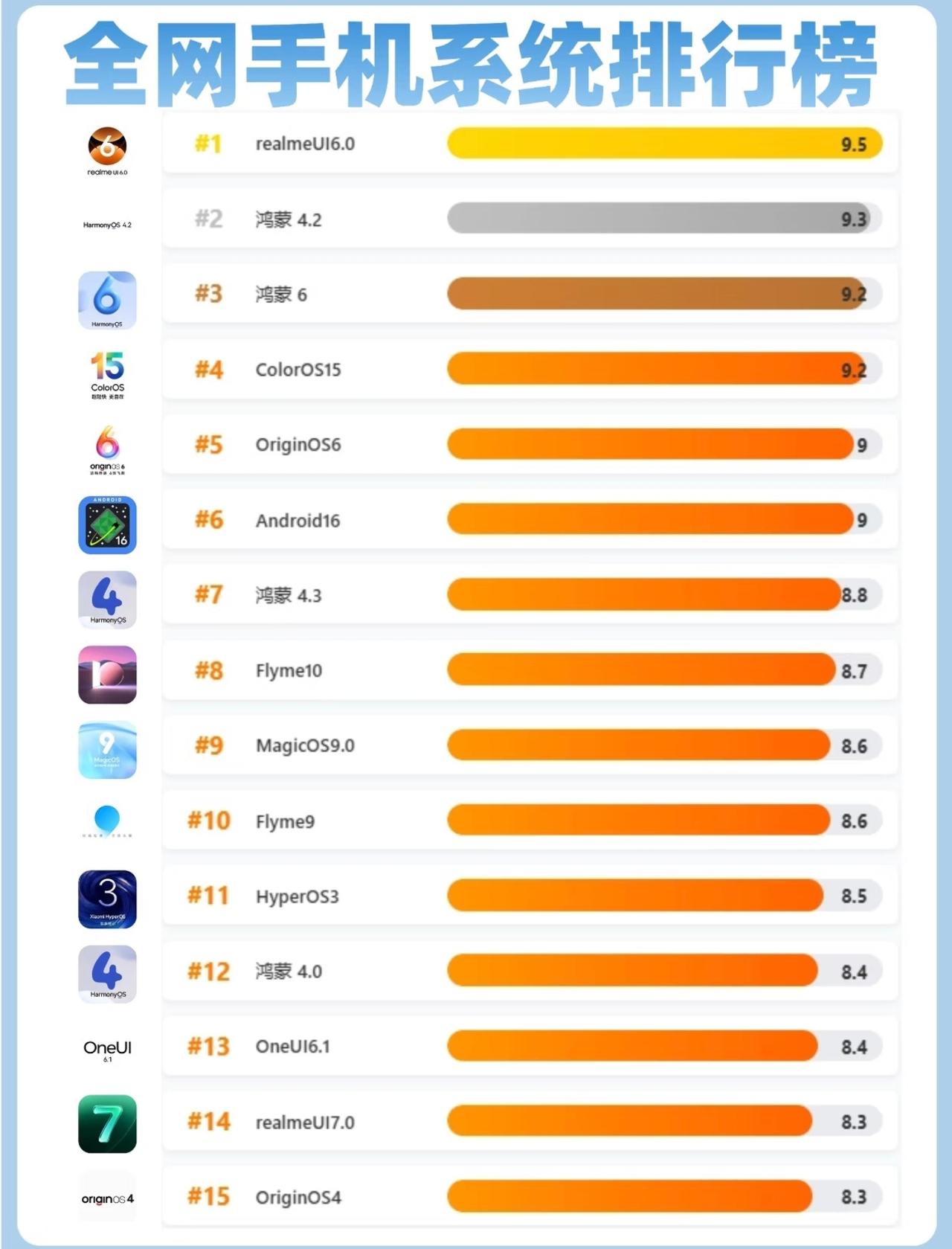 这份全网手机系统排行榜,打破了不少固有印象。realmeUI 6.0以9.5分登顶,说明用户对流畅度、轻量无负担的需求,正在超越品牌光环。鸿蒙系列三款系统分居2、3、7、12位,版本迭代带来的体验差异十分明显,新版鸿蒙6的优化升级让它重回高分梯队,也印证了国产系统的追赶速度。