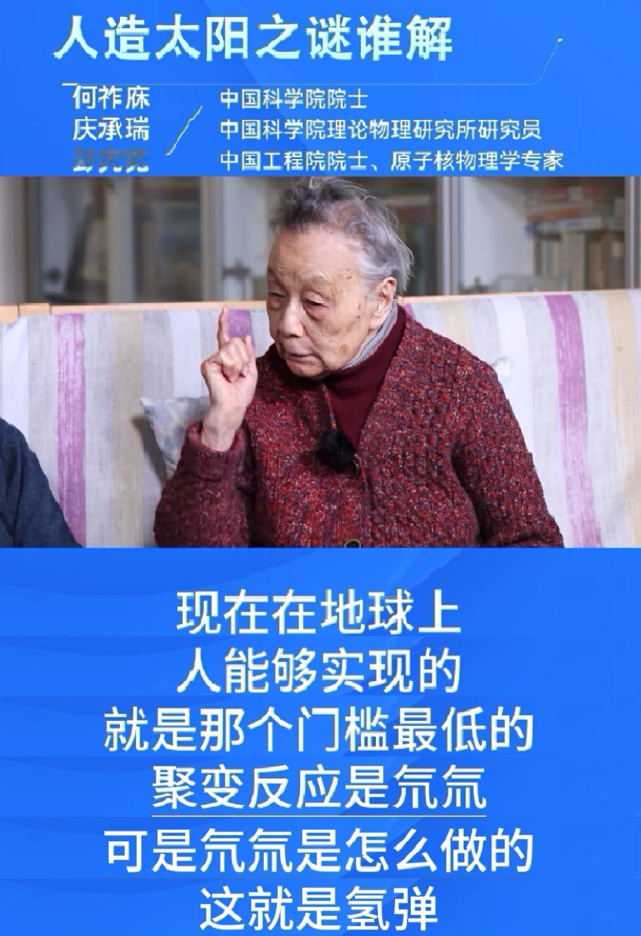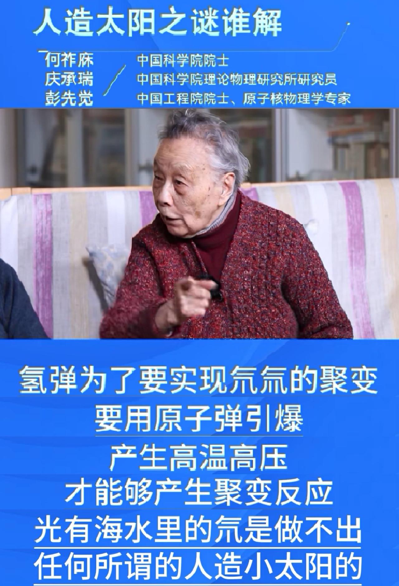 何祚庥院士夫人庆承瑞教授一语道破人造太阳的玄机。最基础的聚变是氘氚聚变,氘氚聚变需要氢弹原理,氢弹需要原子弹引爆,光有海水里的氘是不能造出小太阳的。听何院士夫妇的介绍,加上核物理学家彭先觉院士的解释,感觉很有道理。彭院士还否认了一些人认为“先干起来,说不定能干成”的单纯想法。这种勇于尝试的精神固然可以,但在重大领域,理论上没有突破,你干也干不成,等于是蛮干。