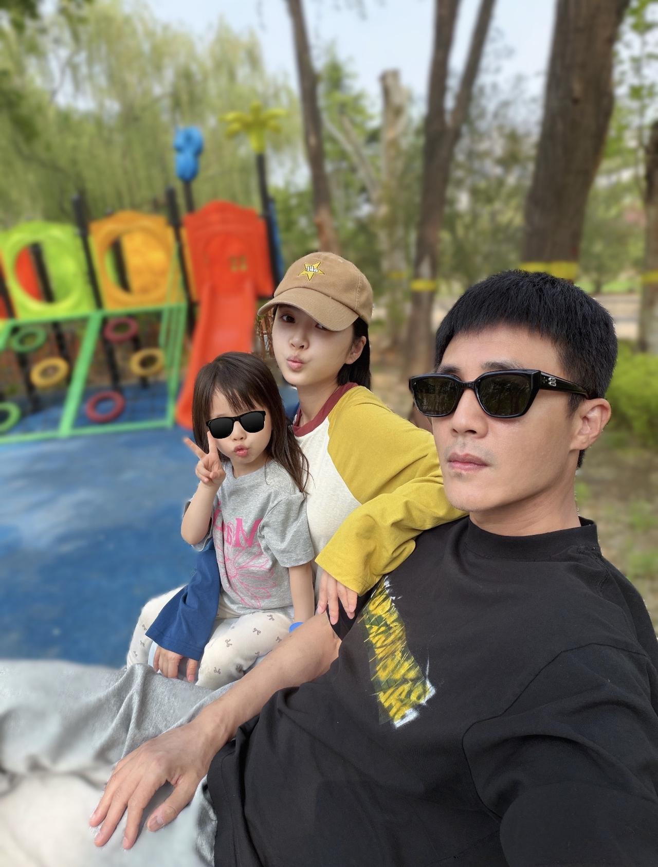 4月25日,杜淳晒一家三口合影,并配文“周末户外溜溜娃”。