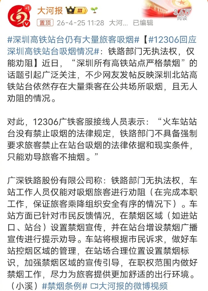 12306回应深圳高铁站台吸烟情况铁路部门回复很无奈: 无执法权,仅能劝阻。对执
