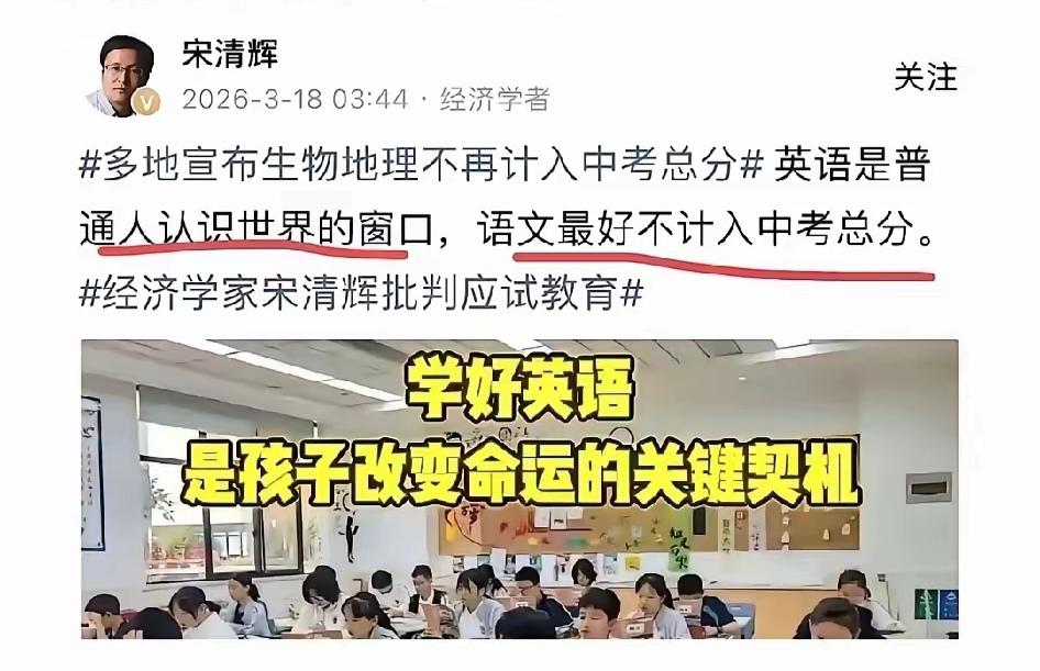 鼓吹语文不计入中考,这是赤裸裸的文化自宫!宋清辉先生,你说英语是普通人认世界的窗口,学好英语是孩子改变命的关键契机,这无可厚非,因为每个人的价值值观不一样,我们允许有不同观点的存在!