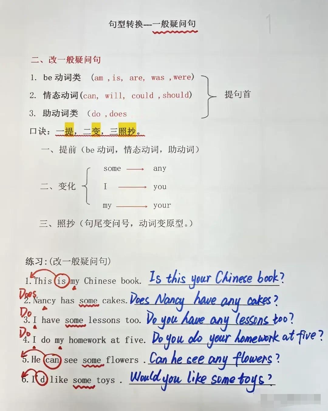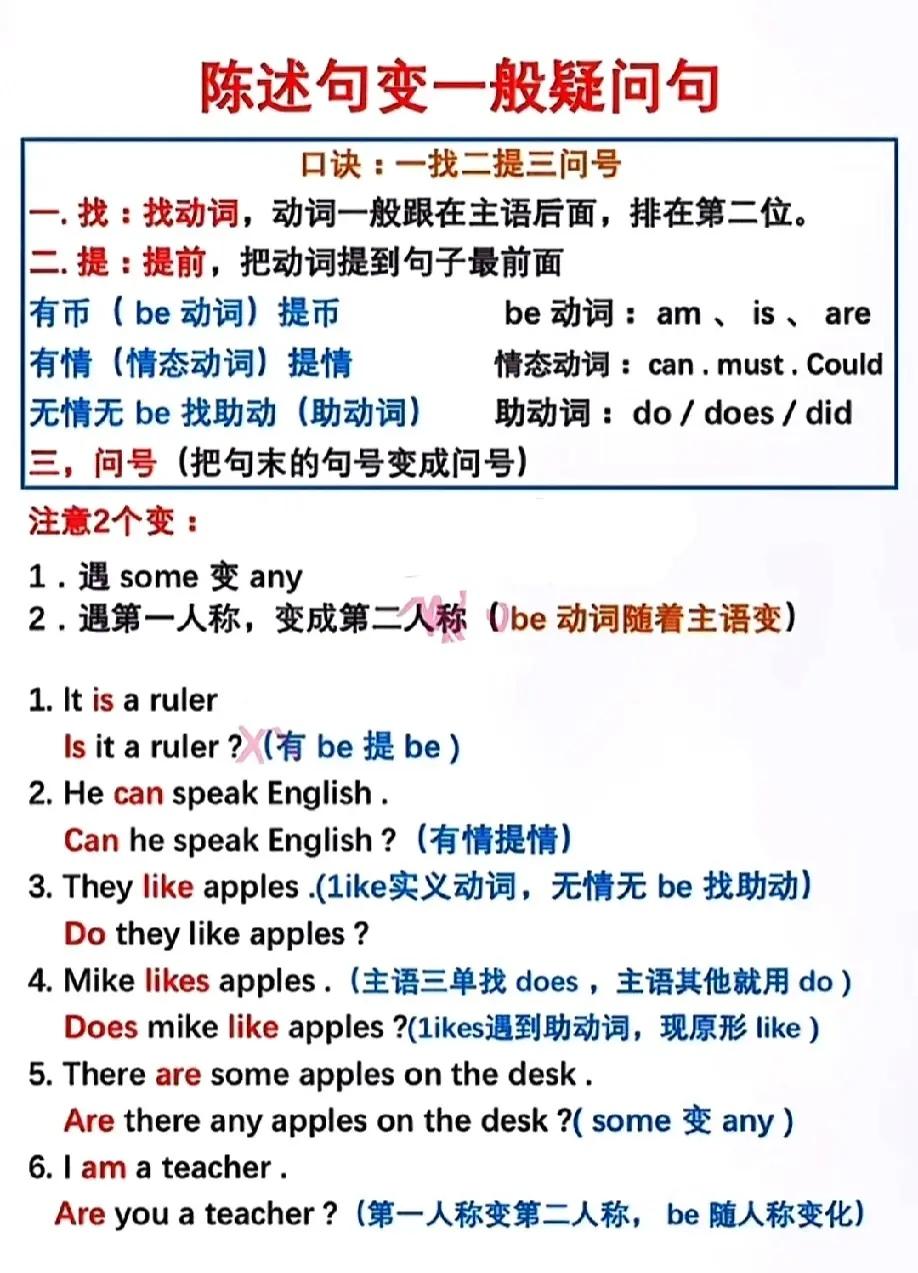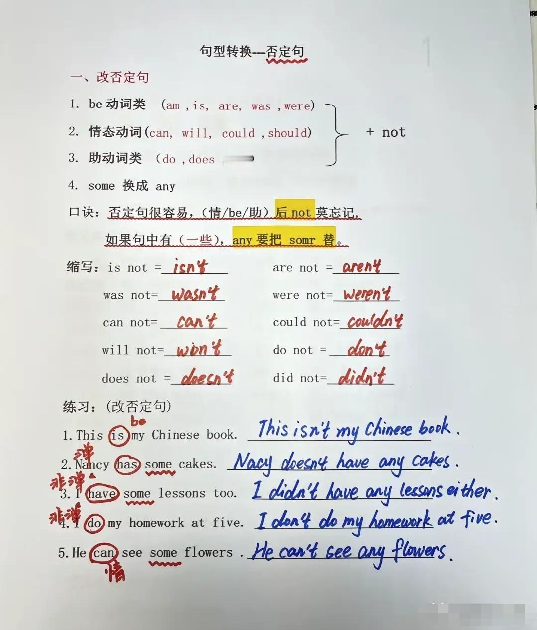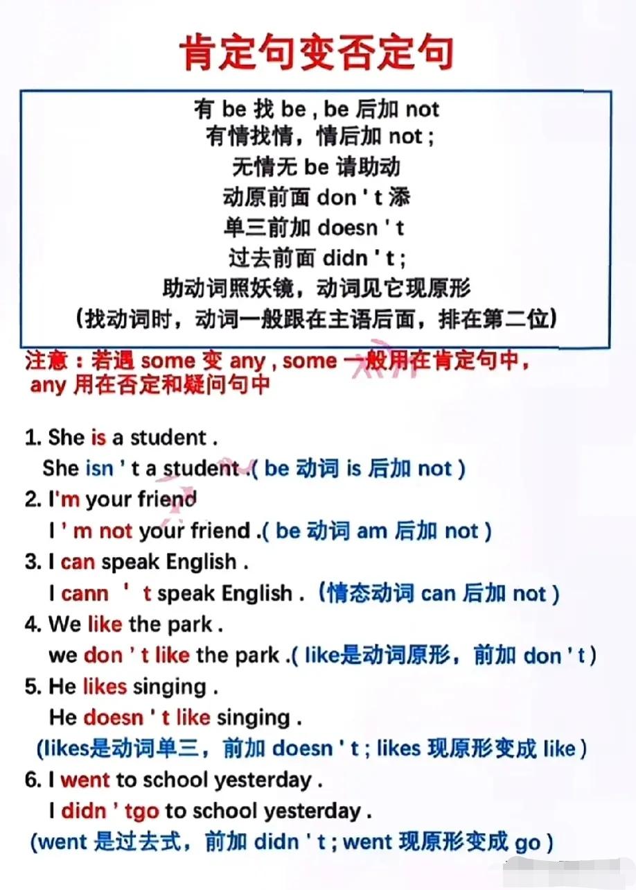 be动词提在前,not加在be后面;情态动词最简单,提前加not就变完;实义动词要帮忙,do/does/did来上场。还有some变any,人称要转换,一套口诀覆盖所有考点。