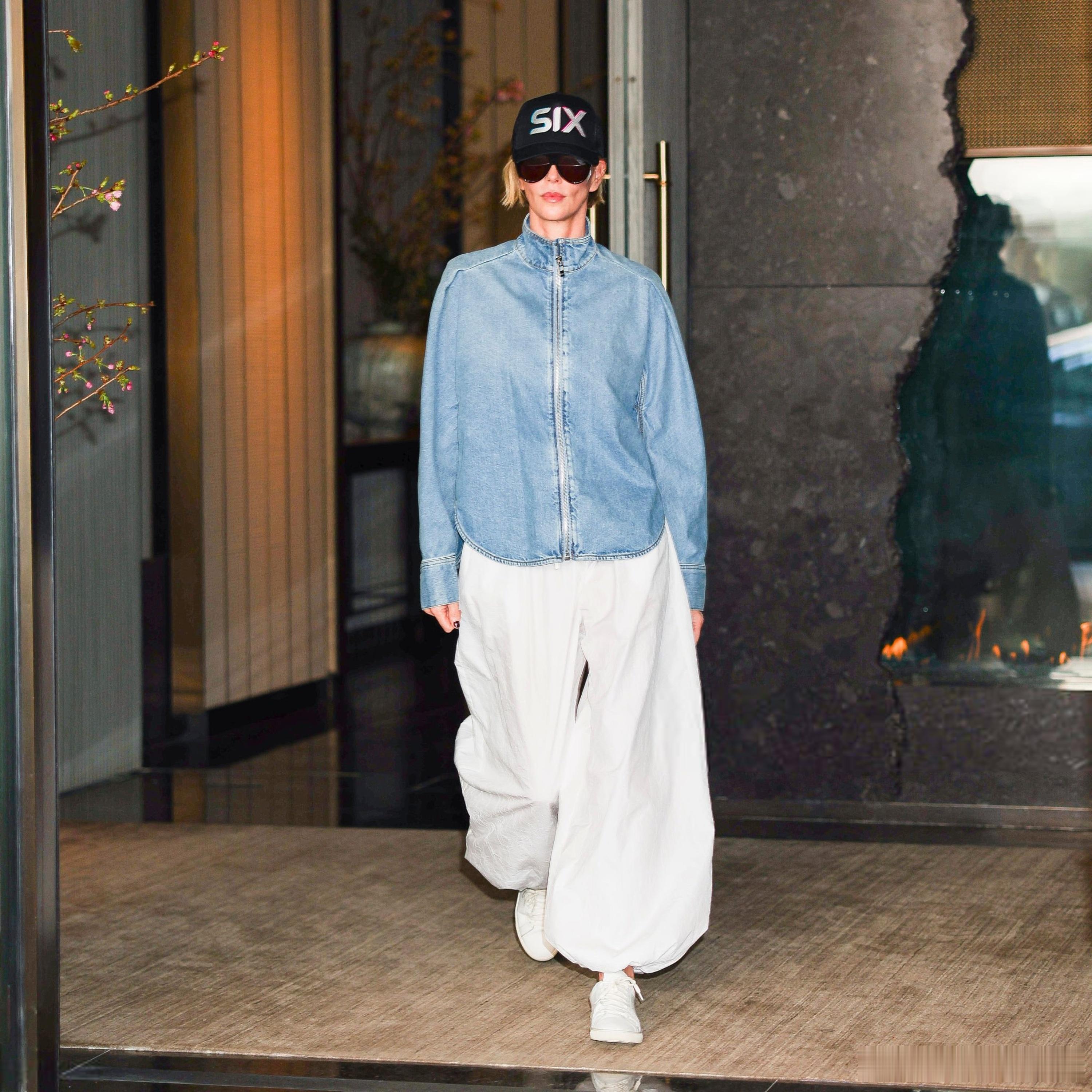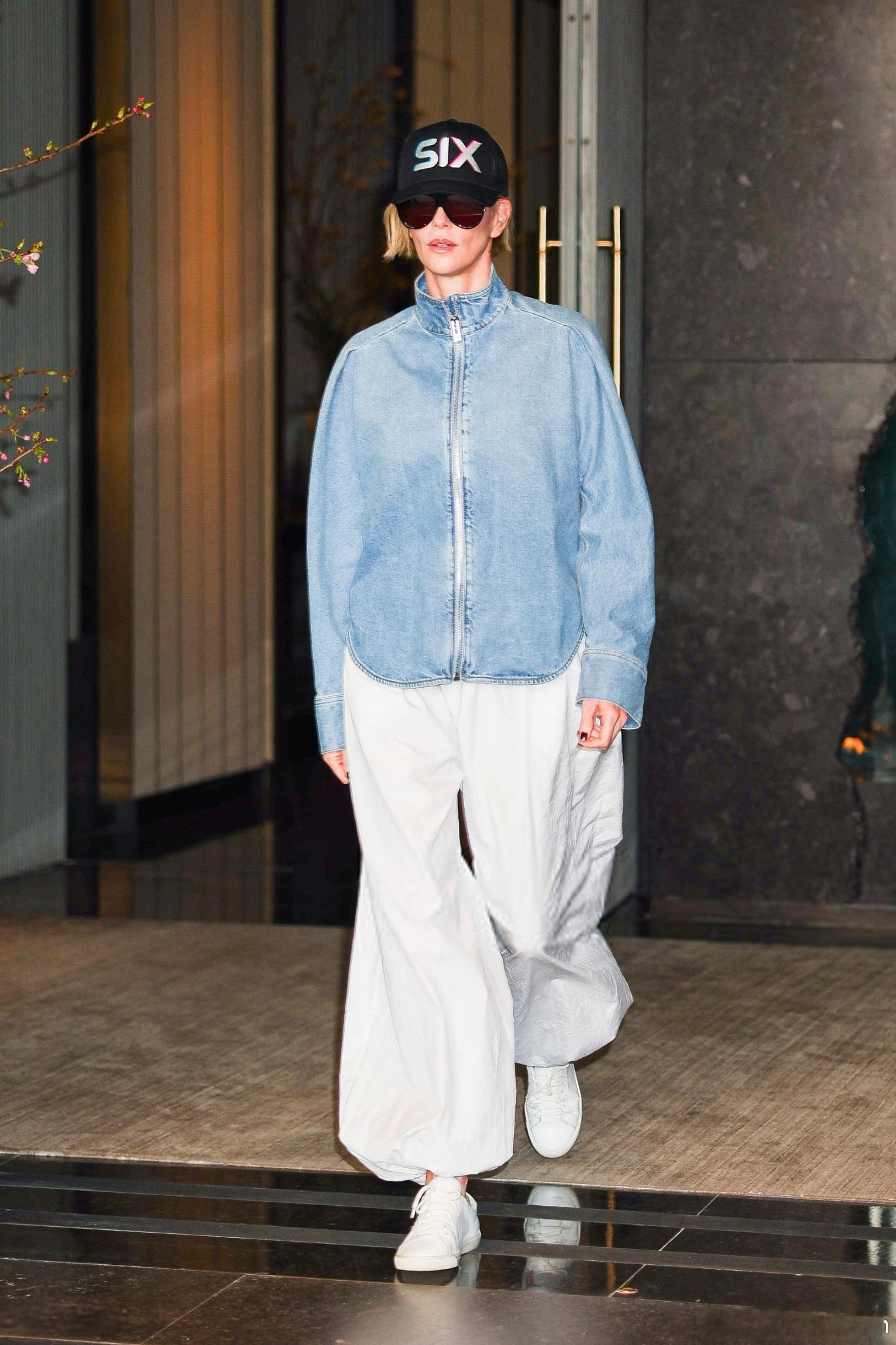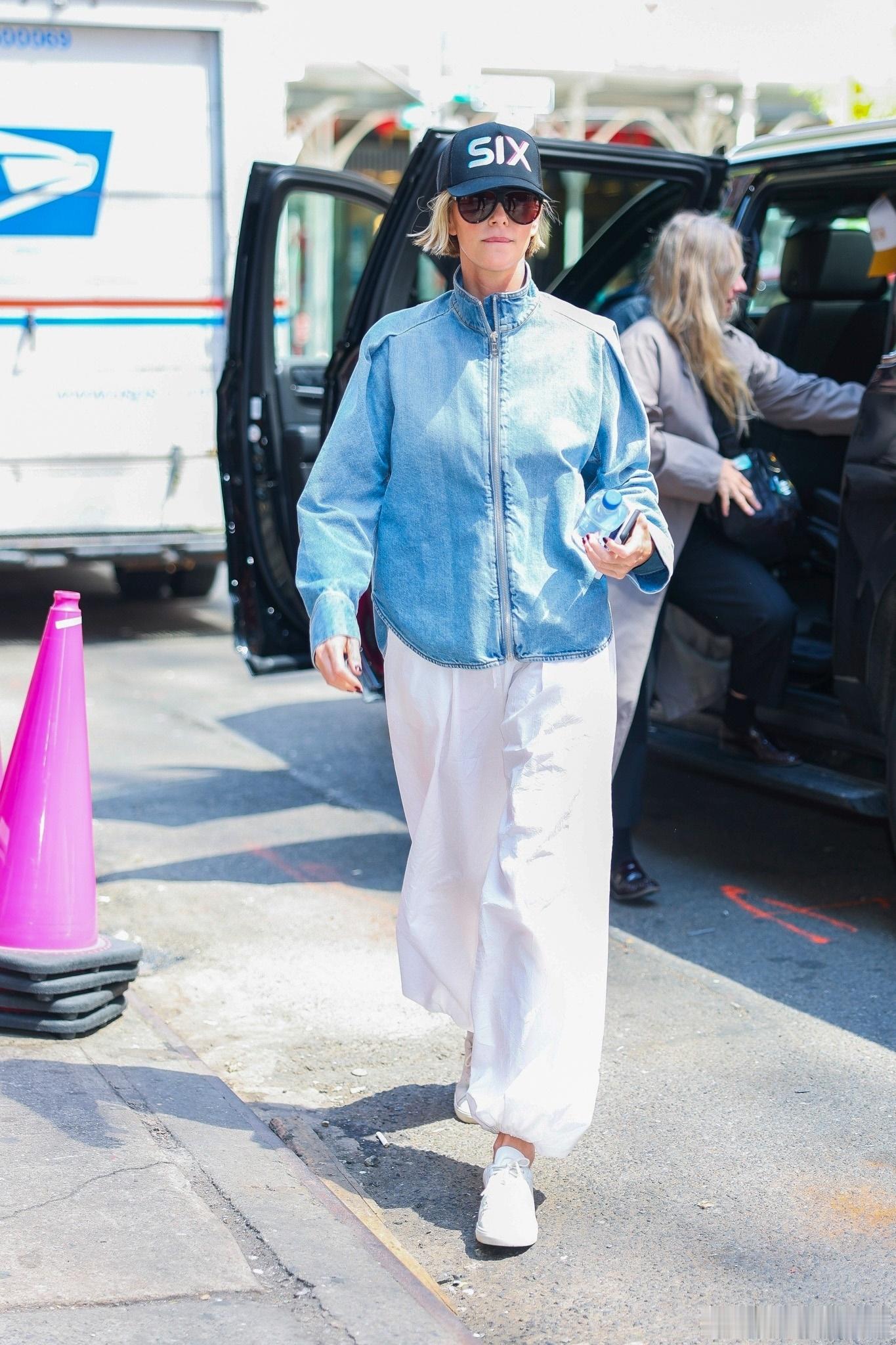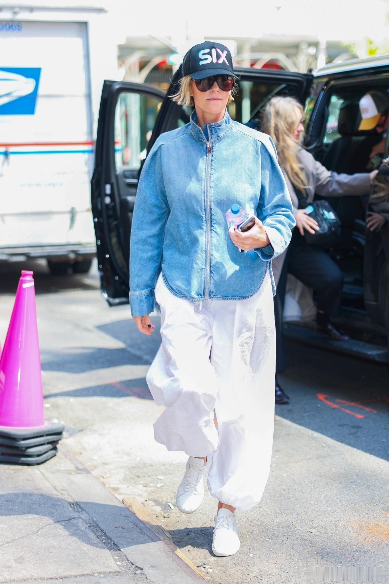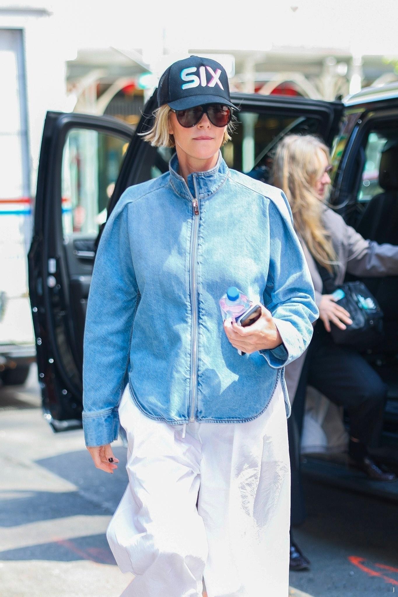 Charlize Theron查理兹塞隆在纽约外出,离开酒店前往时代广场攀岩宣传新片《叠峰猎杀》