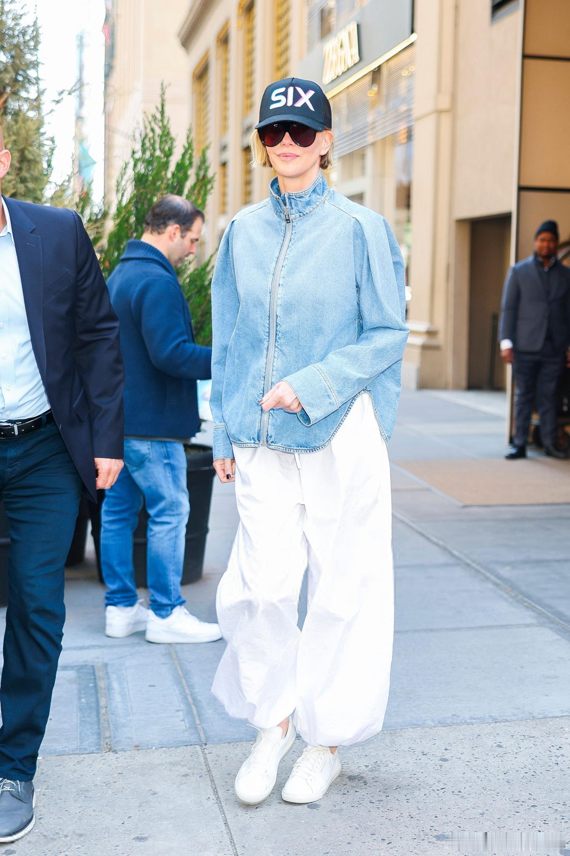 Charlize Theron查理兹塞隆在纽约外出,离开酒店前往时代广场攀岩宣传