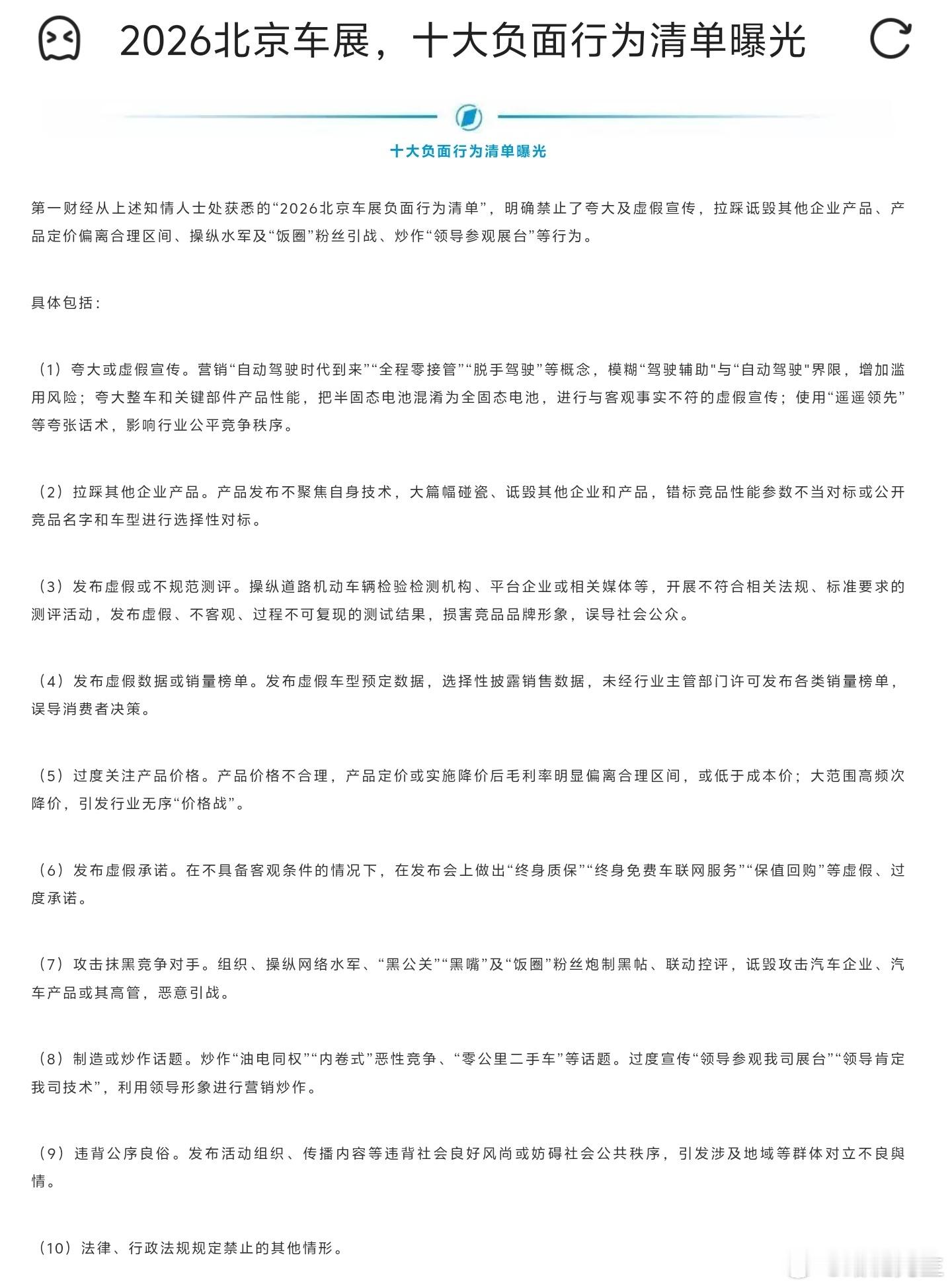 第一财经:2026北京车展,十大负面行为清单曝光。营销不得使用“全程零接管”“脱