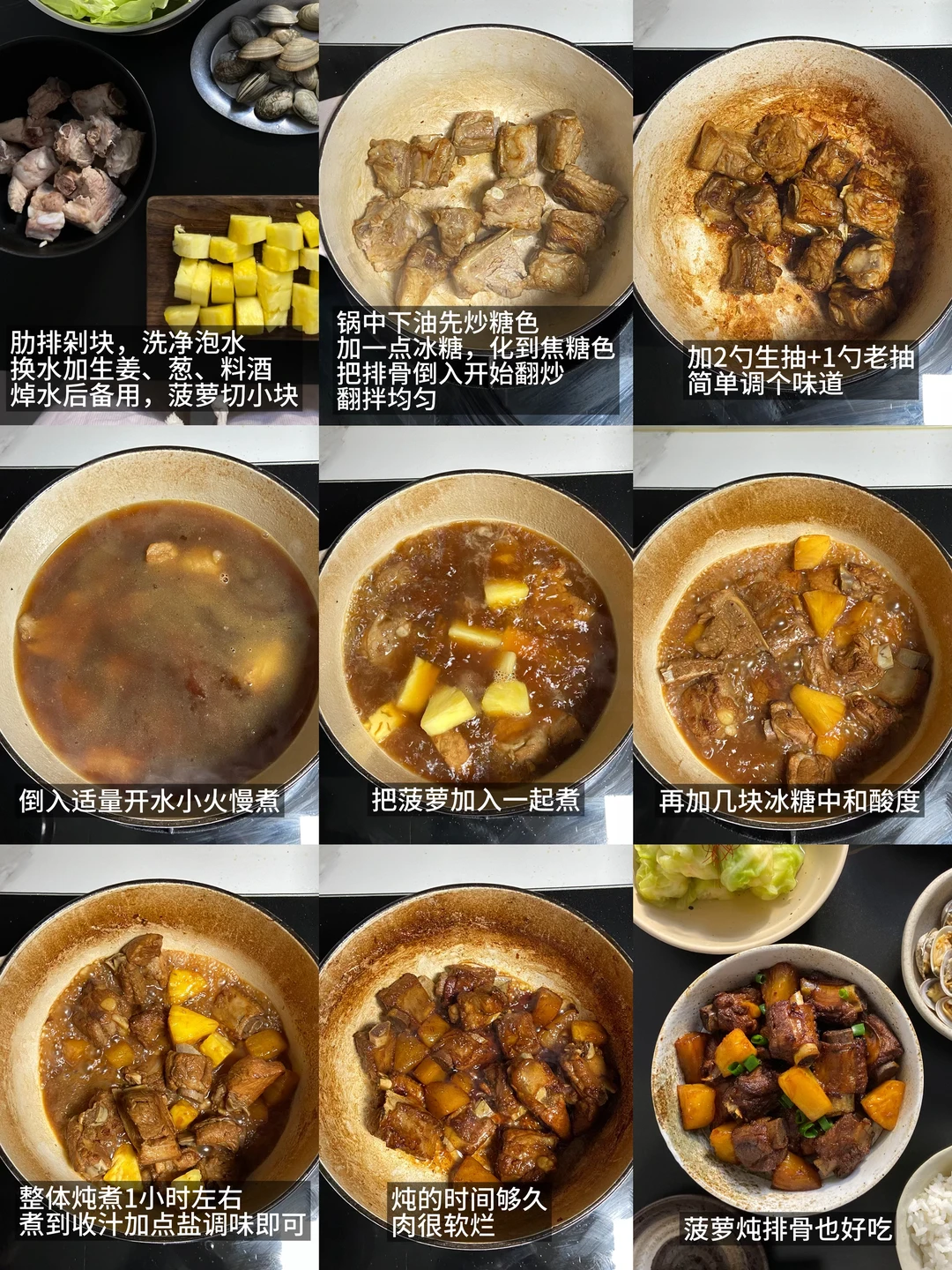 4)整体炖煮1小时左右,煮到收汁加点盐调味即可,菠萝一起煮之后肉挺嫩的,带一点酸甜味好吃