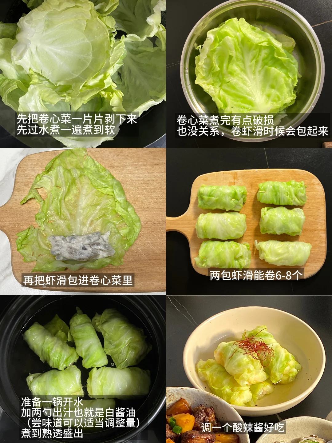 1)先把卷心菜一片片剥下来,先过水煮一遍煮到软,再把虾滑包进卷心菜里