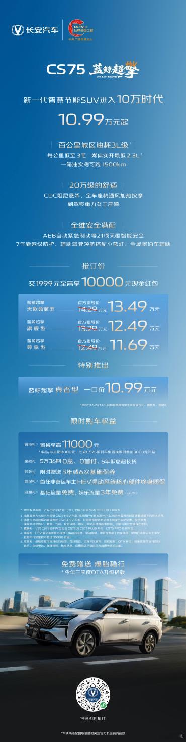 极致省油,长安第四代逸动蓝鲸超擎 7.99 万起舒适大空间,长安第四代 CS75PLUS 蓝鲸超擎 SUV 10.99 万起