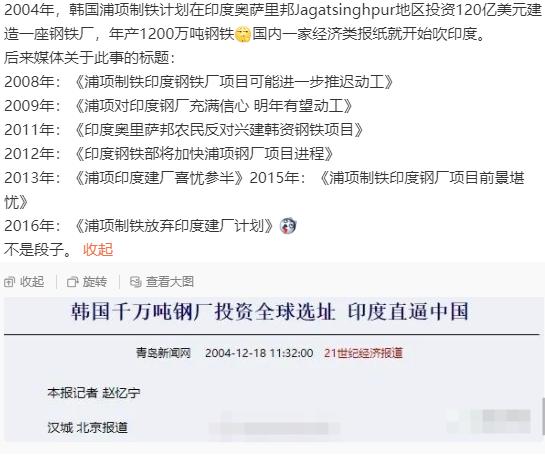 突然就想起了韩国的浦项制铁,从2004年计划建厂,到2017年彻底退出,浦项制铁在印度大概亏算了20亿美元,而且是血本无归的那种。工厂和基建计划,全都搁置在了印度,一分钱利润都没有挣到。最终结果是一吨钢未产,全部投资损失,浦项制铁于2017年退还土地,并退出项目。