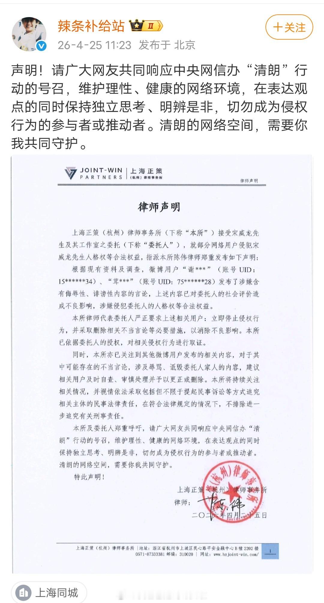 宋威龙工作室维权告黑了
