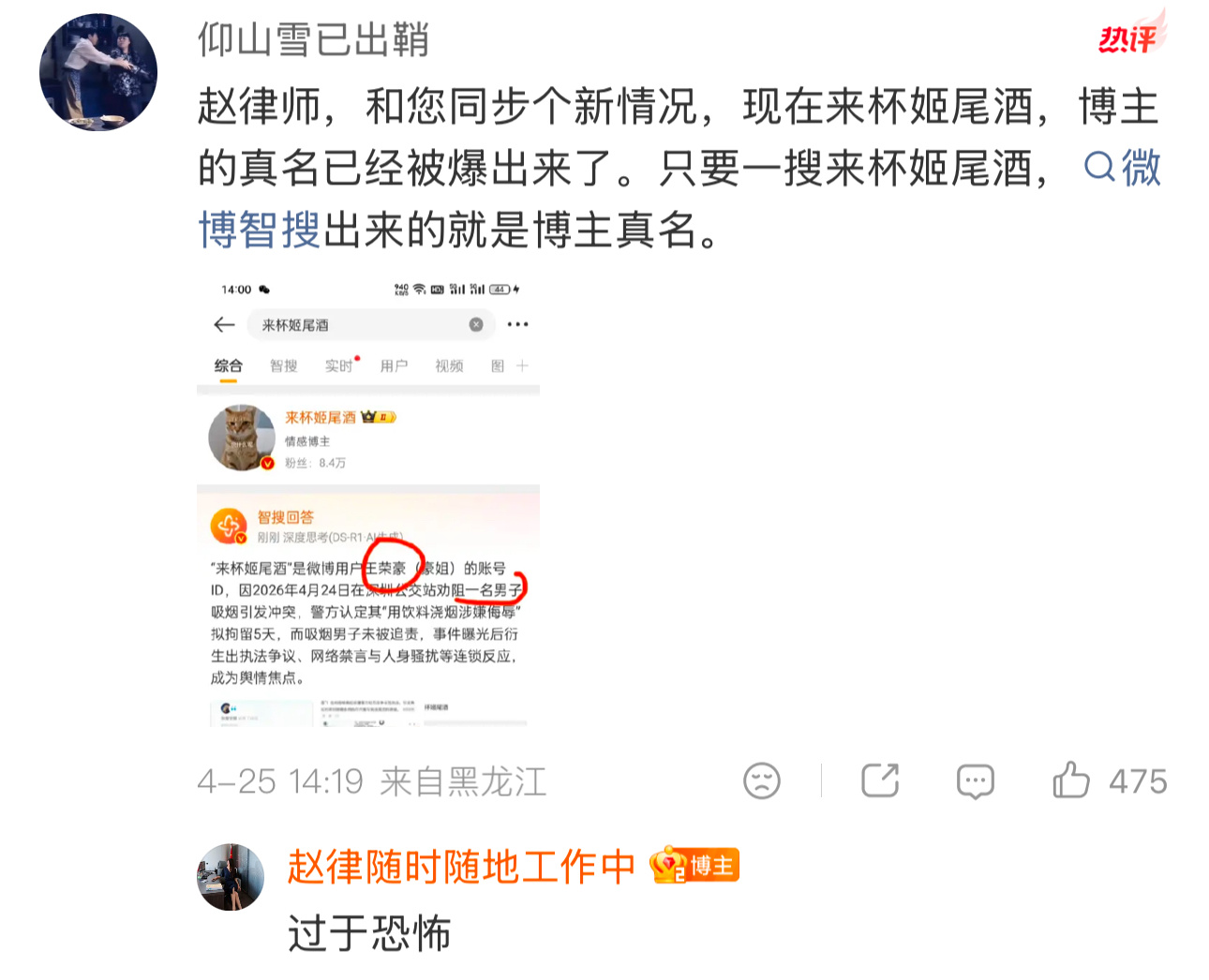 在赵一婕律师评论区看到有网友问,为什么智搜上有来杯姬尾酒的真名那是3月份,给她推长文的时候介绍过,所以被智搜给收录了,不只是真名,还有她的人生经历