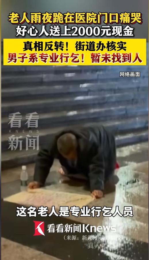 信息来源:《老人雨夜跪在医院门口痛哭 好心人送上2000元现金 真相反转!街道办核实:男子系专业行乞!暂未找到人》看看新闻Knews