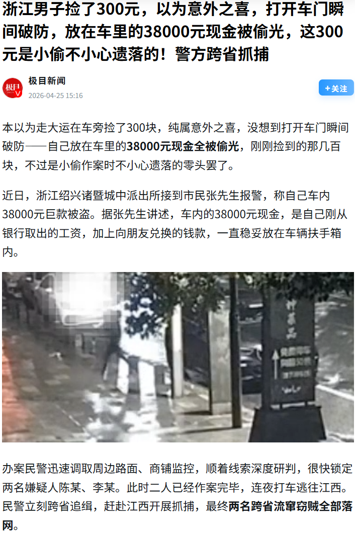 【东北老铁】哎呀妈呀!这可真是天上掉馅饼——砸脑门上了!浙江绍兴有个老弟张先生,搁车旁边捡了300块钱,正搁那儿美呢,心想"今儿走大运了"。结果一拉开车门,哎呀妈呀,破大防了!扶手箱里38000块钱全让人掏空了!你瞅瞅这整的,捡那300块哪是啥意外之喜啊,那是小偷作案时掉地上的零头,纯属"钓鱼式"刺激!