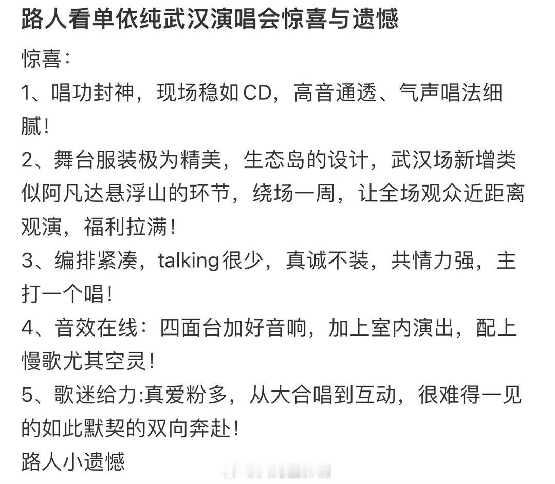 单依纯演唱路人口牌 有人看完大受震撼,说这是自己看过最好的演唱会之一。歌单衔接丝滑,《纤维》现场绝了。之前只听过好声音那几首,第一次因为歌手嗓音美到落泪,看完直接圈粉。原话是:“看完真的成粉丝了,下次还要来。”